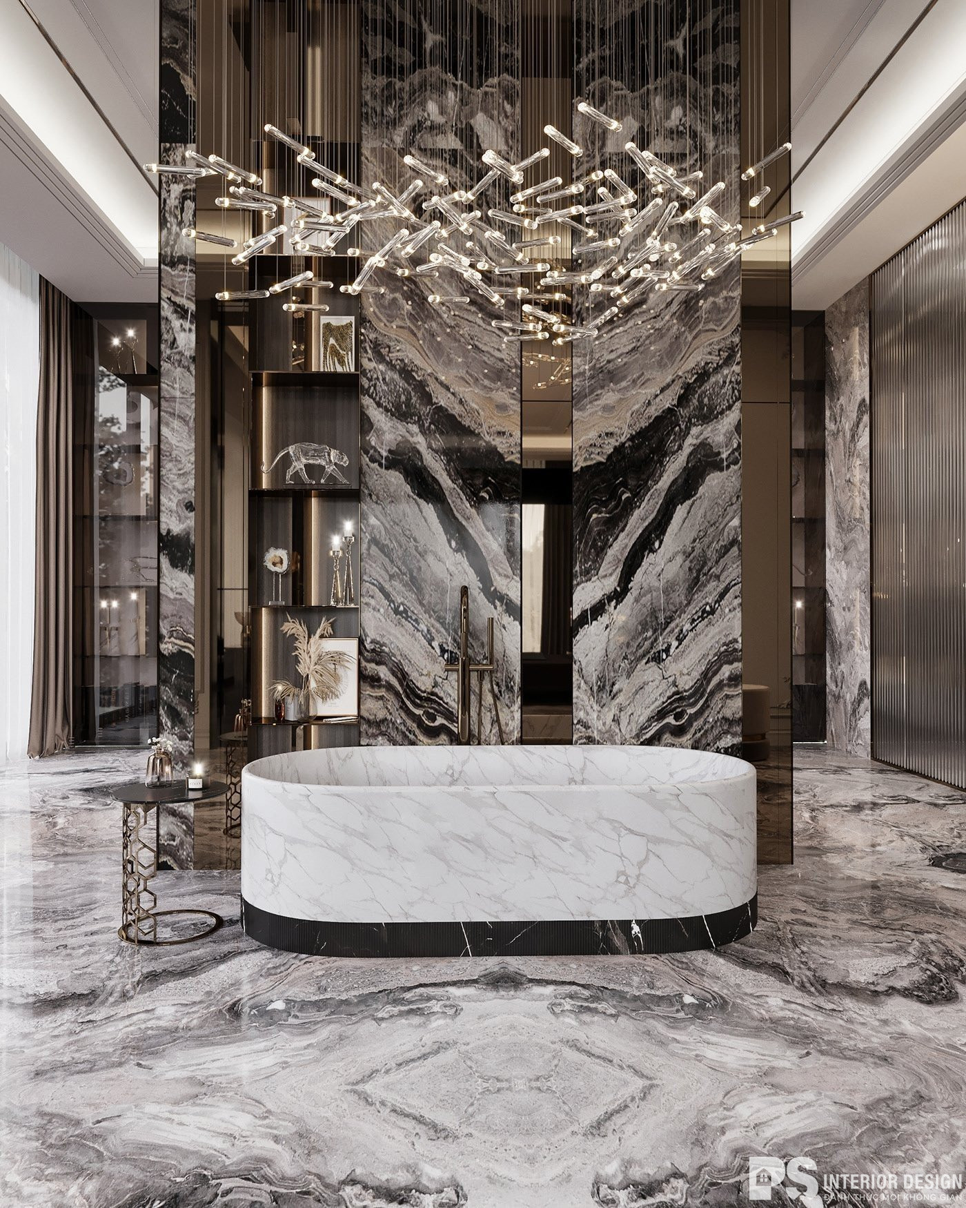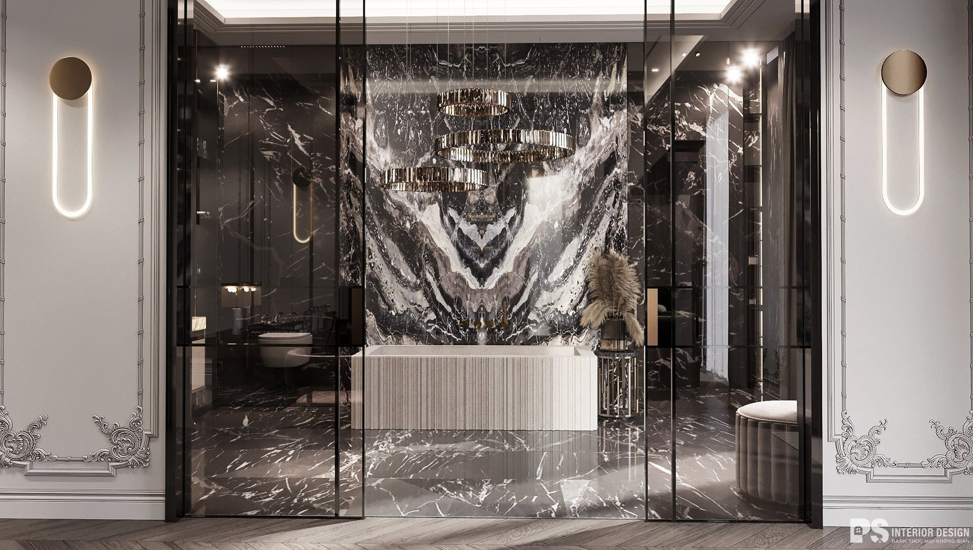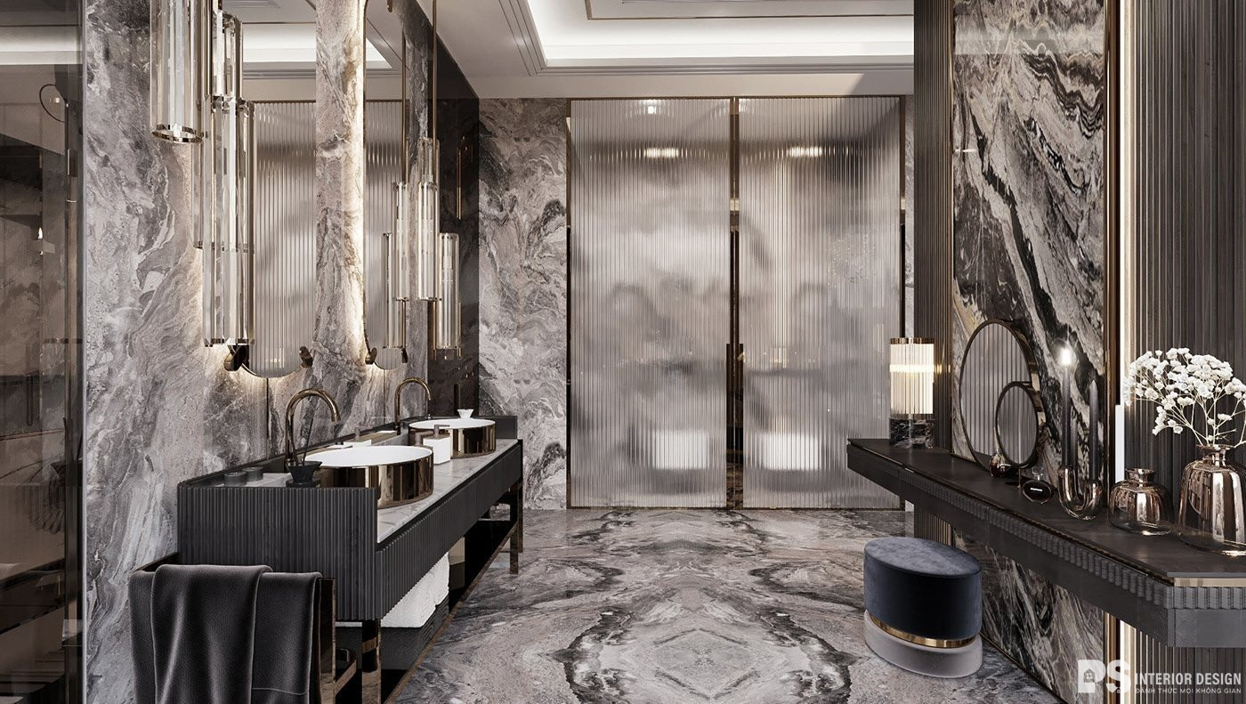 Vách toilet được ốp đá có các vân đá nhìn vô cùng sang trọng nhưng lại không kém phần tinh tế.
