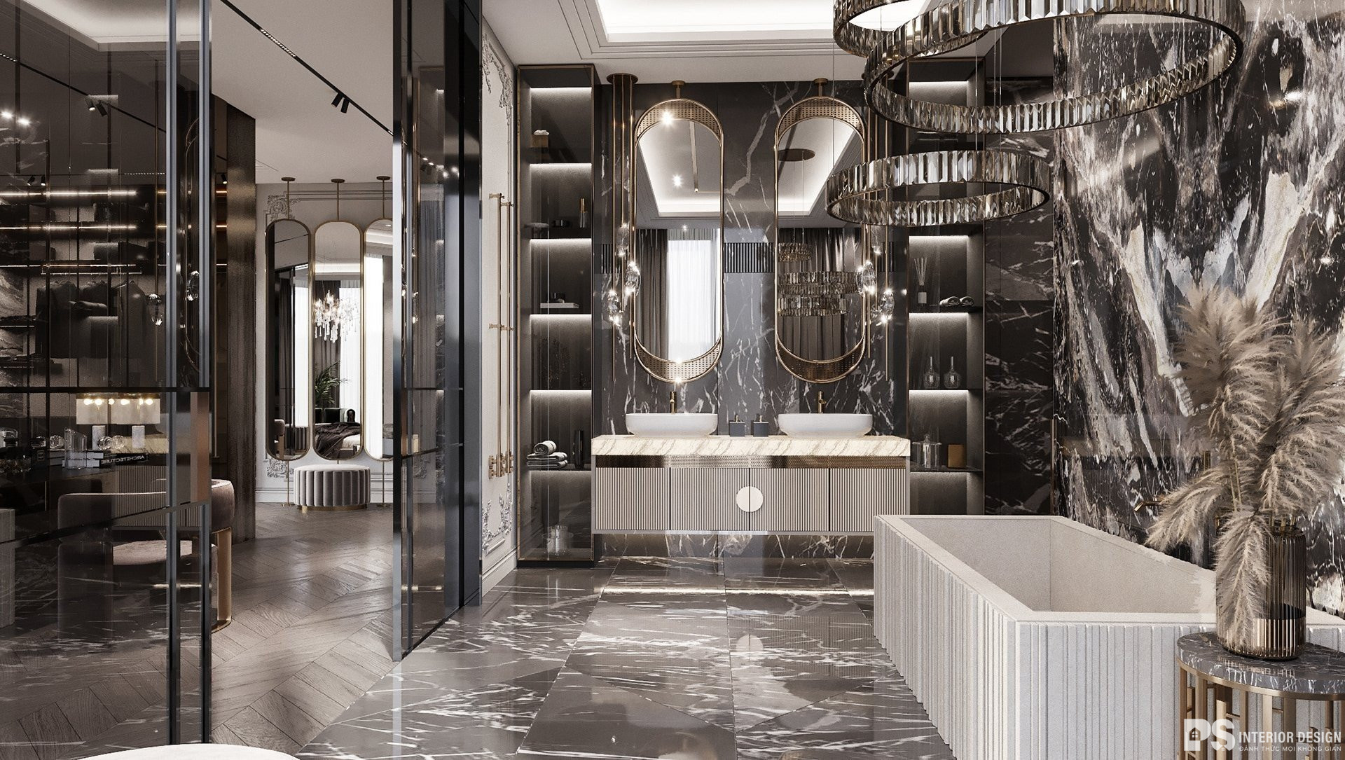 Kết cấu của toilet cũng được sử dụng các gam màu đen - trắng vô cùng xa hoa và lộng lẫy.