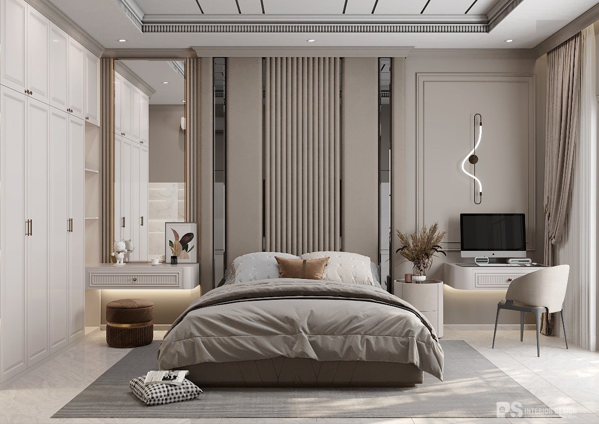 Với thiết kế các hệ tủ đồ, bàn làm việc, bàn trang điểm, rèm đã mang đến một không gian riêng tư hơn, làm cho phòng ngủ trở nên lãng mạn hơn. Cách bố trí các vật dụng nội thất cũng không quá rườm rà, mang đến cảm giác thoải mái cho người nhìn.