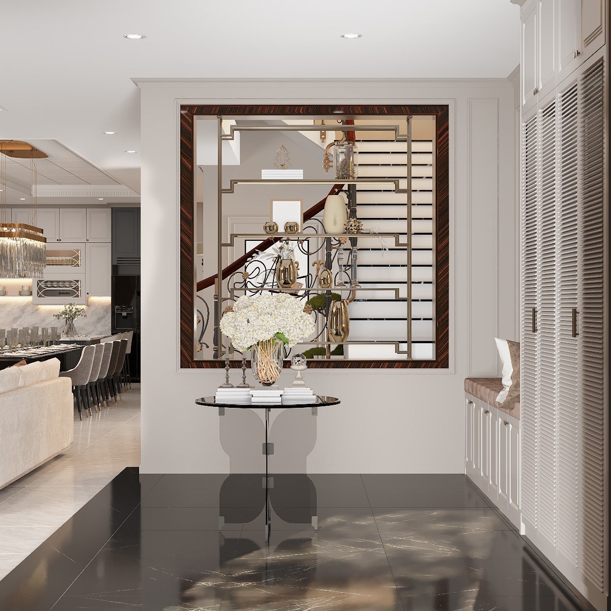Phong cách Tân cổ điển nhận được sự yêu thích nhờ sở hữu cho mình một không gian sống đẹp tinh tế nhưng lại không quá phô trương như. Từng đường nét cầu kỳ đã được lược bỏ, mang đến sự tinh gọn. Thể hiện nét đẹp cổ kính, nhẹ nhàng với các họa tiết trên bức tường cùng những đường thẳng sắc sảo bắt mắt người nhìn