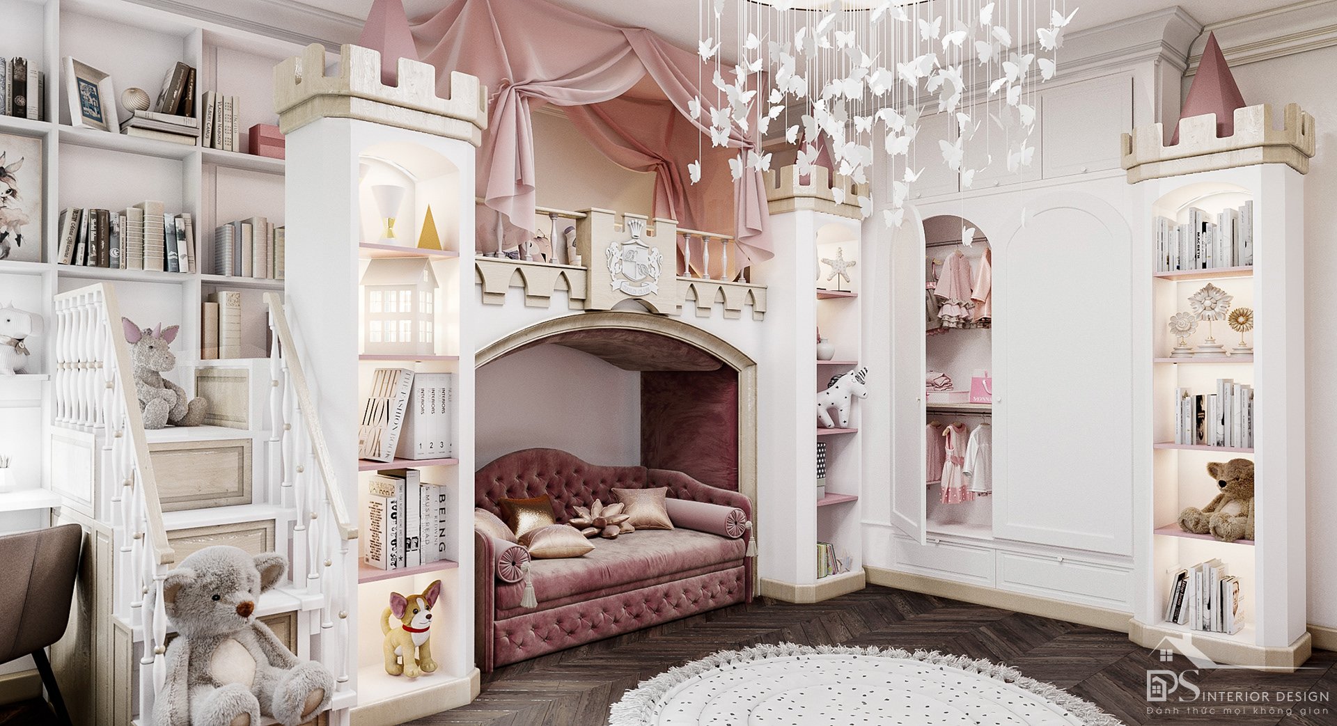 Các bé gái thường thích các tông màu dịu nhẹ, nên PS INTERIOR DESIGN đã chọn màu hồng trên nền trắng của cả căn nhà. Làm bật lên được sự nhẹ nhàng nhưng lại không kém phần cá tính. Giường và ghế sofa được xây dựng theo kiểu lâu đài chắc chắn sẽ làm bé trong nhà có cảm giác như mình là một công chúa nhỏ tại nơi đây