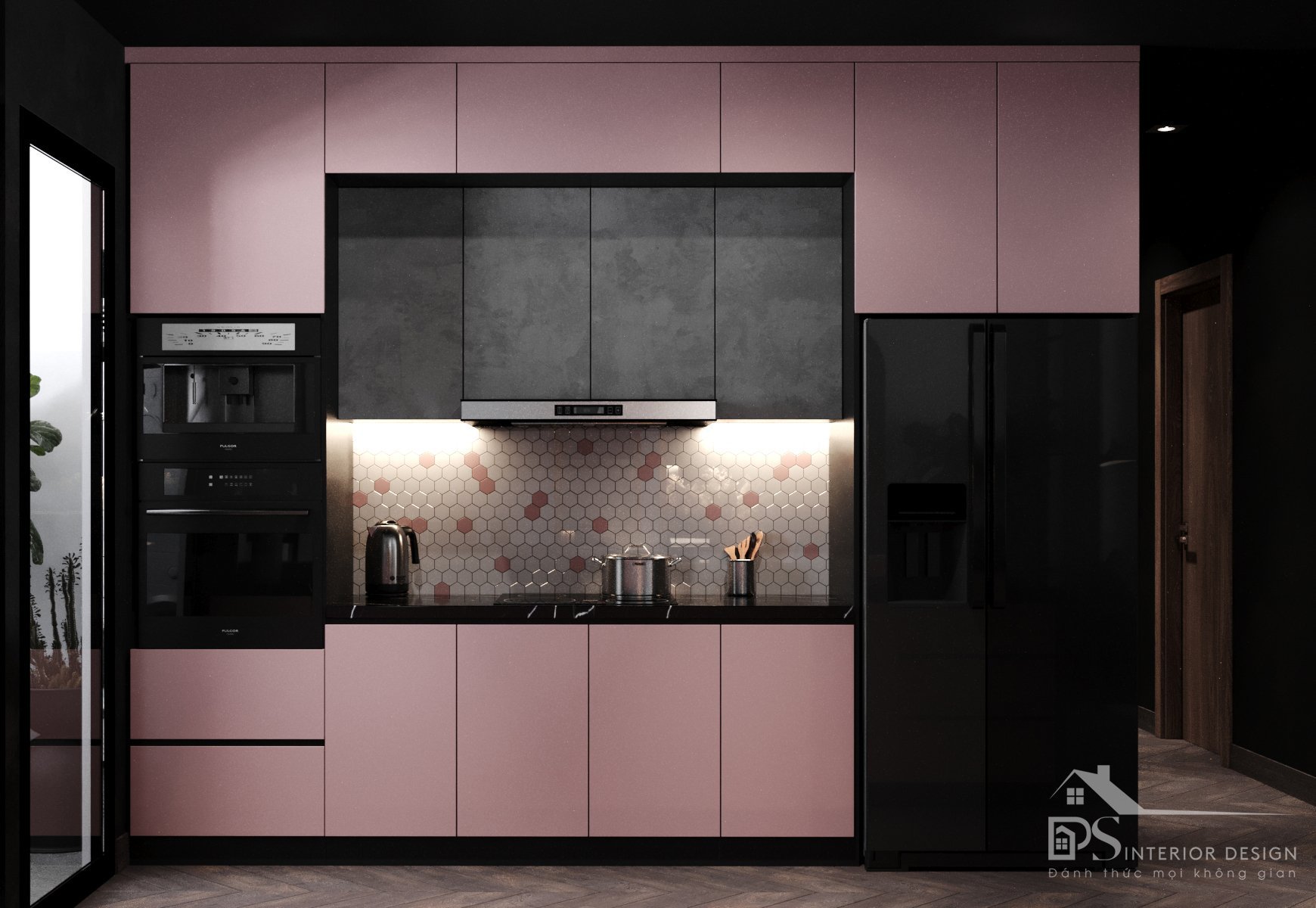 Nội thất phòng bếp được kết hợp hài hòa giữa tông màu đen và hồng, phù hợp với những gia chủ có tính cách nhẹ nhàng nhưng lại thích phá cách. Mặt tủ giả đá tạo nên sự thuận tiện cho việc nấu nướng thao tác cho bà nội trợ