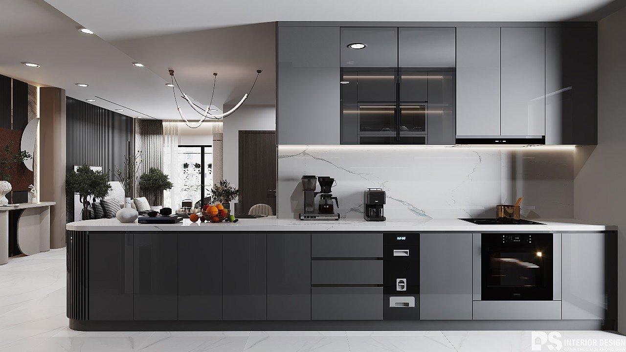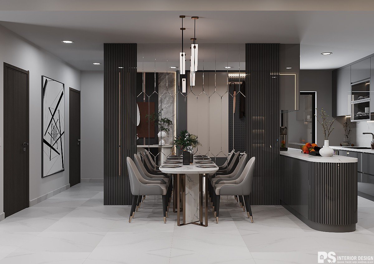 Hầu hết các căn hộ hiện nay luôn thiết kế phòng bếp và phòng khách được thông với nhau, tại đây nhằm ngăn cách tinh tế giữa khách và bếp đã sử dụng bộ bàn ghế ăn bọc da sử dụng màu xám nhằm trung hòa lại màu sắc và tránh sự nhàm chán cho gia chủ.