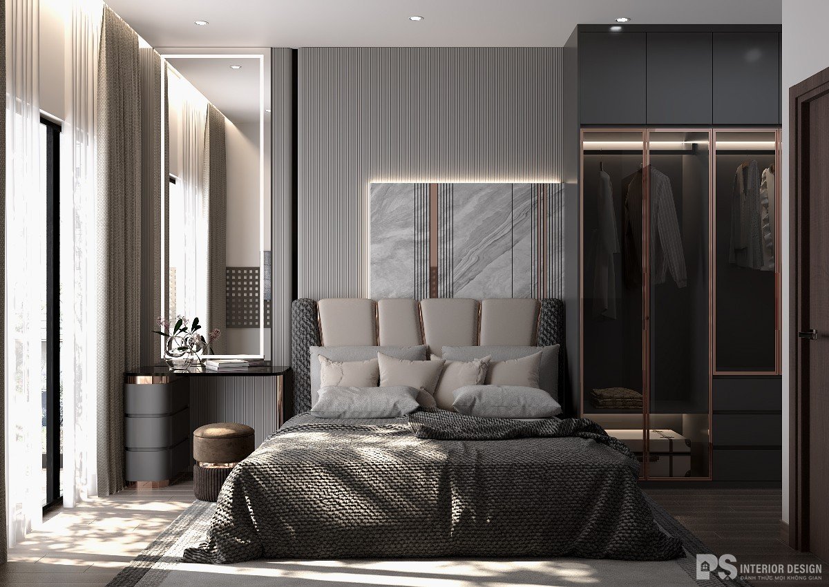 Thiết kế mới lạ với vách ốp đầu giường với những đường kẻ không theo sự sắp đặt nào mang tính tự do, mang đến cho chủ nhà cảm giác thoải mái, phóng khoáng không bị bó buộc. Miếng ốp tường đầu giường sử dụng mặt giả đá nhằm tăng thêm sự sang trọng, kiêu sa cho căn phòng.