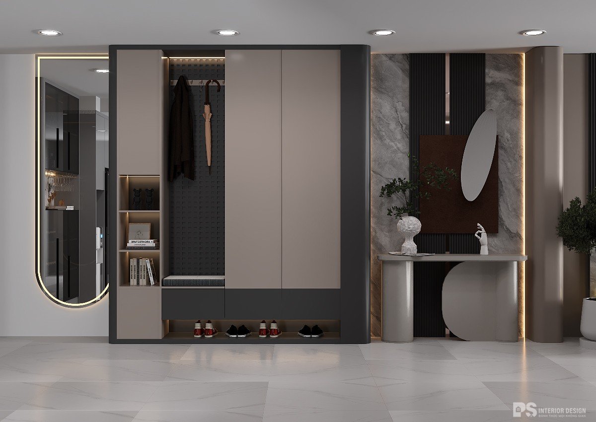 Phía cửa được bố trí kệ để giày kết hợp tủ nhằm mang đến nhiều công năng cho gia chủ cũng như góp thêm phần trang trí cho căn nhà thêm hài hòa.