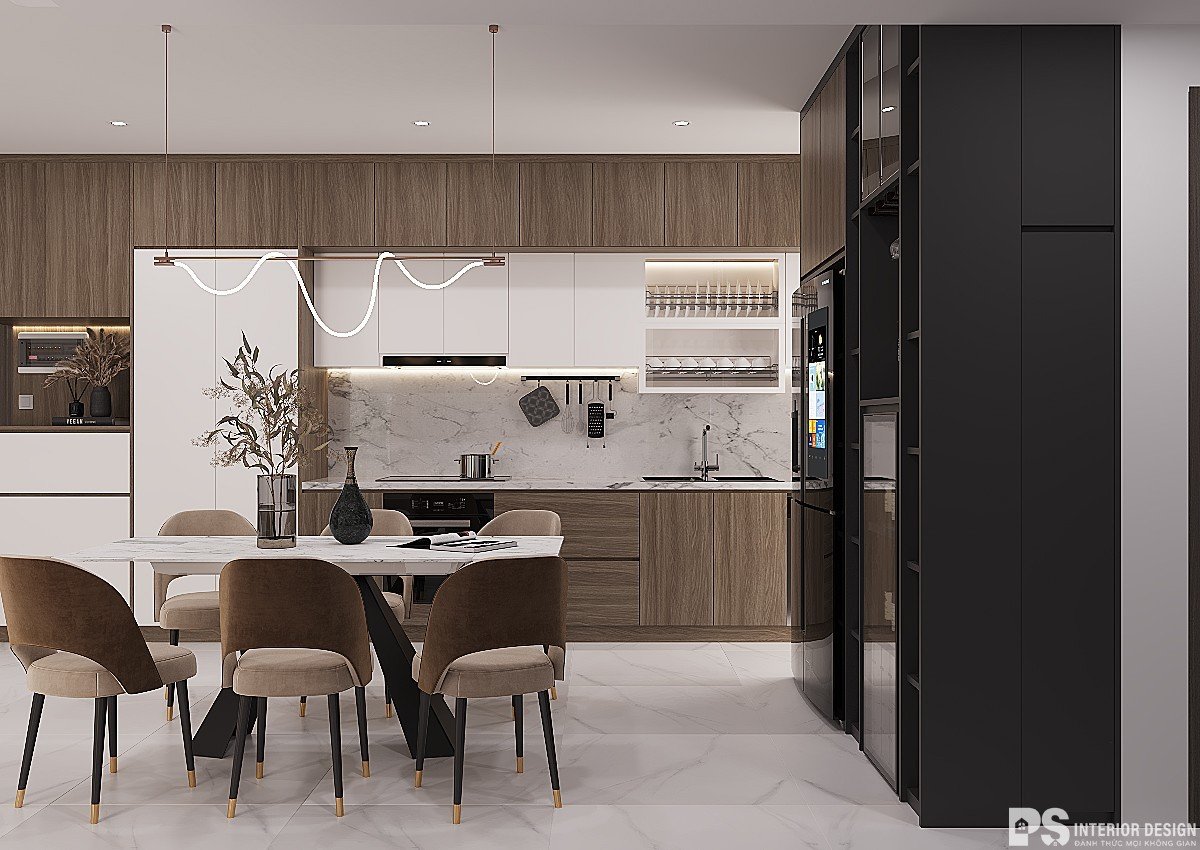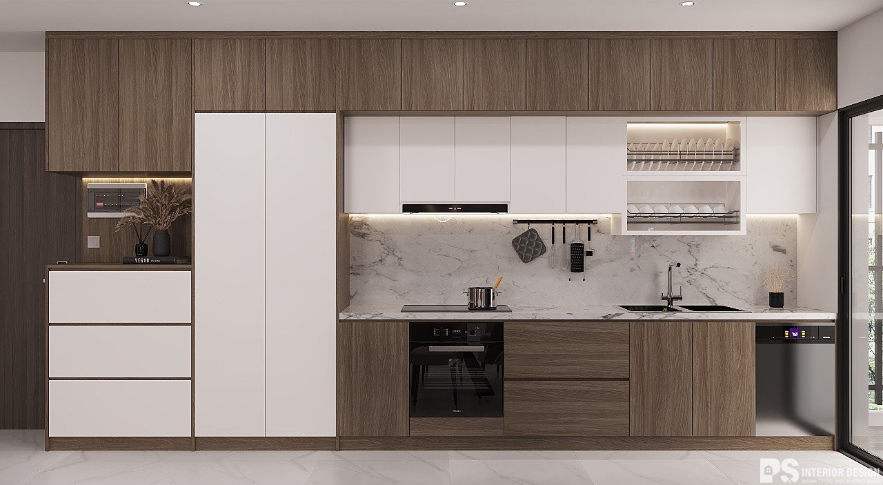 Một phòng bếp đẹp sẽ khơi gợi lên cảm hứng nấu ăn của bà nội trợ, đem lại những bữa ăn ngon và ấm áp cho cả gia đình. Ở đây các KTS đã chọn các màu như nâu gỗ, trắng để làm cho căn bếp có cảm giác thân thiện hơn và tận dụng được hết mọi công năng.