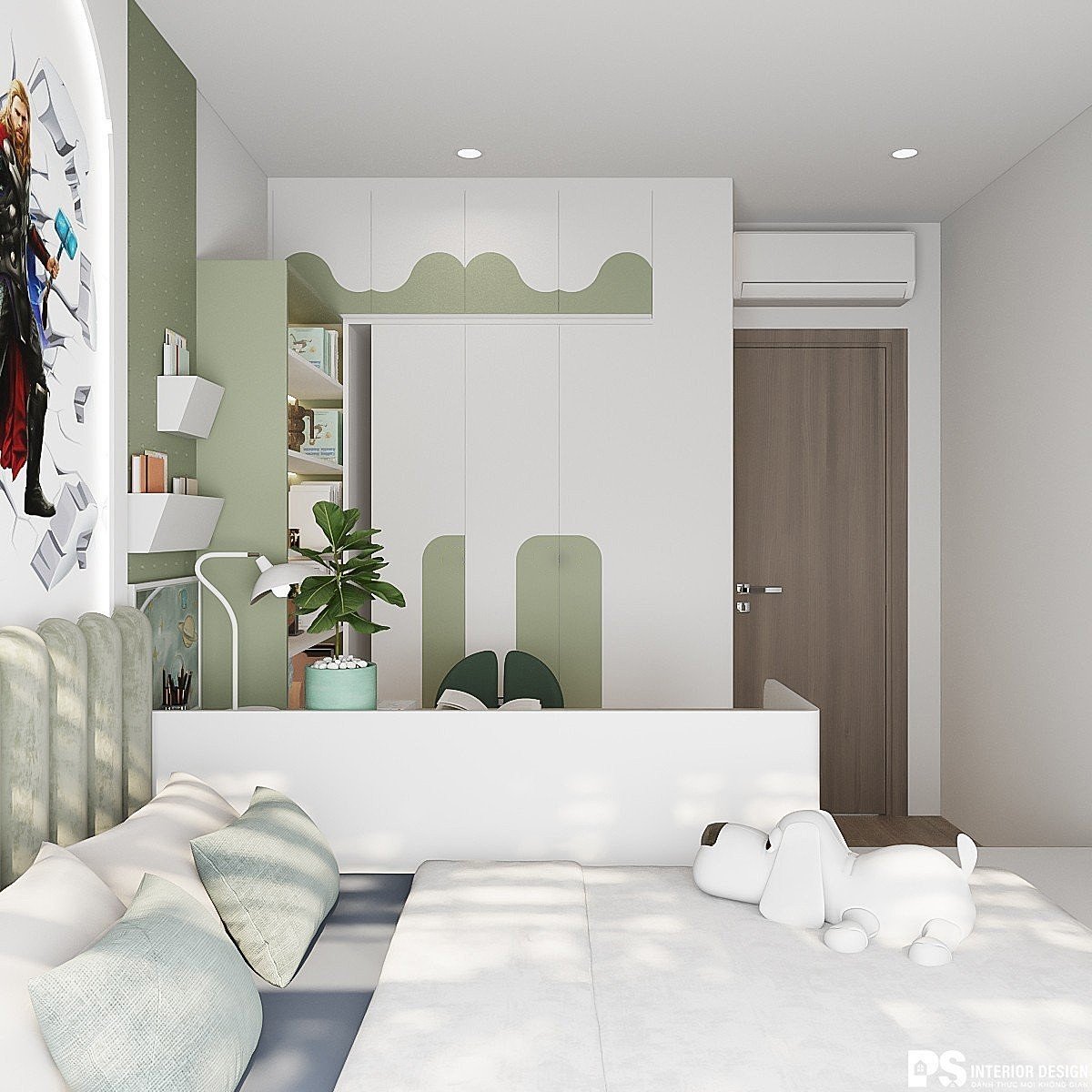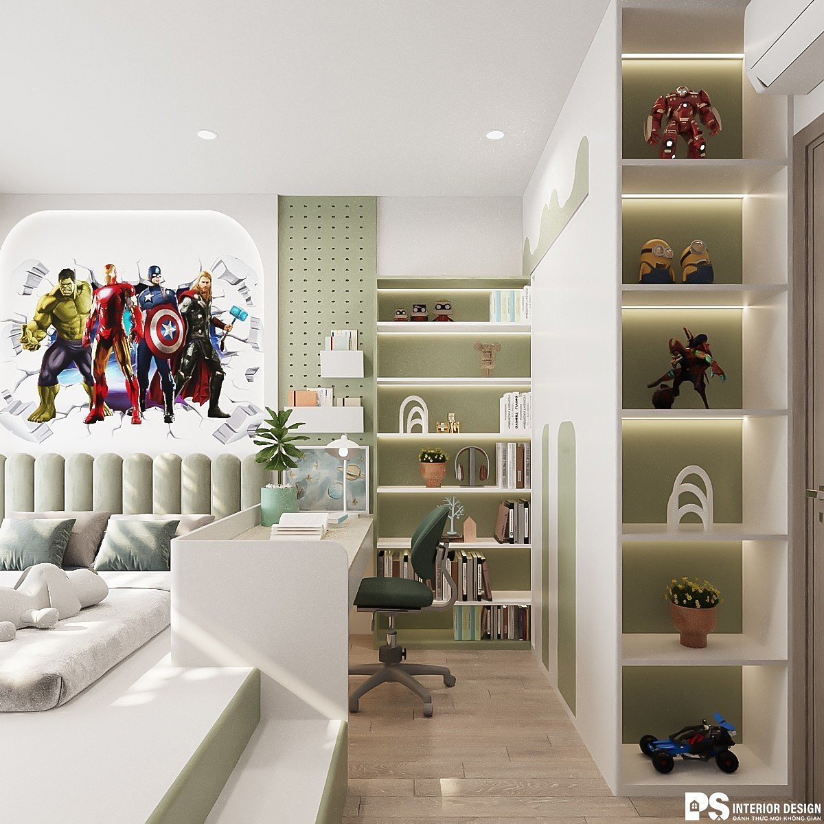Phòng bé trai được chọn tông màu mạnh mẽ với chủ đề siêu anh hùng tạo nên một không gian phù hợp với sở thích và tính cách của trẻ . Việc lựa chọn kích thước và chiều cao của giường, tủ quần áo, bàn học phù hợp với con trẻ, giúp tránh các tai nạn xảy ra.