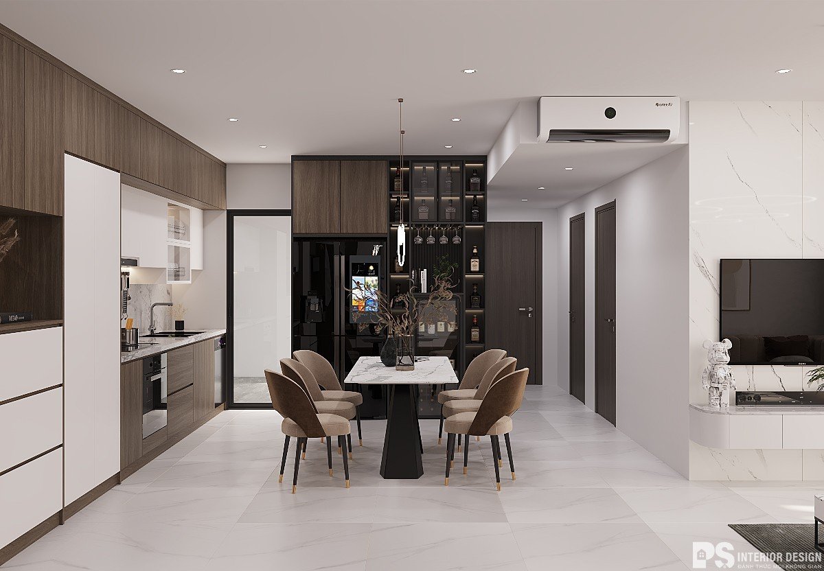 Đi kèm với đó là tủ rượu với màu đen huyền bí làm cho cả gian phòng trở nên sang trọng và hiện đại hơn.