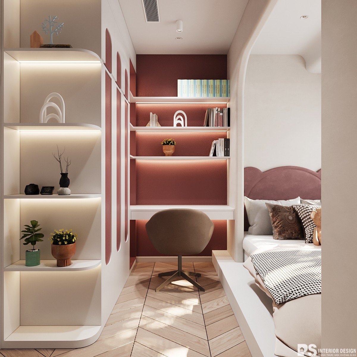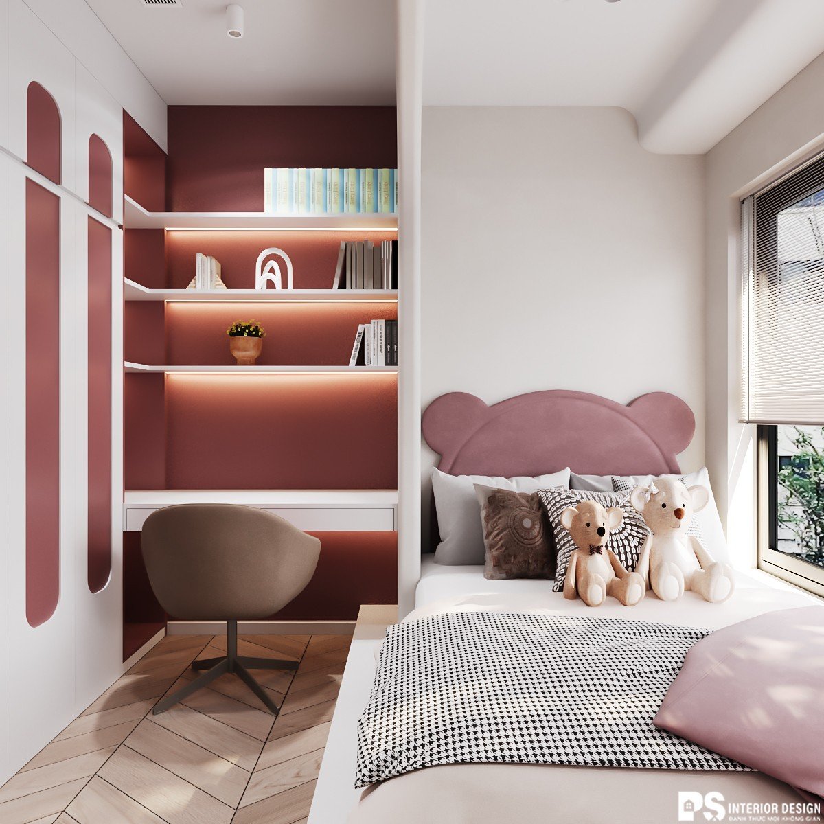 Màu hồng thường phù hợp với các bé gái, không gian ngủ trở nên mềm mại và nhẹ nhàng hơn khá nhiều. Giúp các bé có thêm một không gian để giải tỏa sau những giờ học tập mệt mỏi.