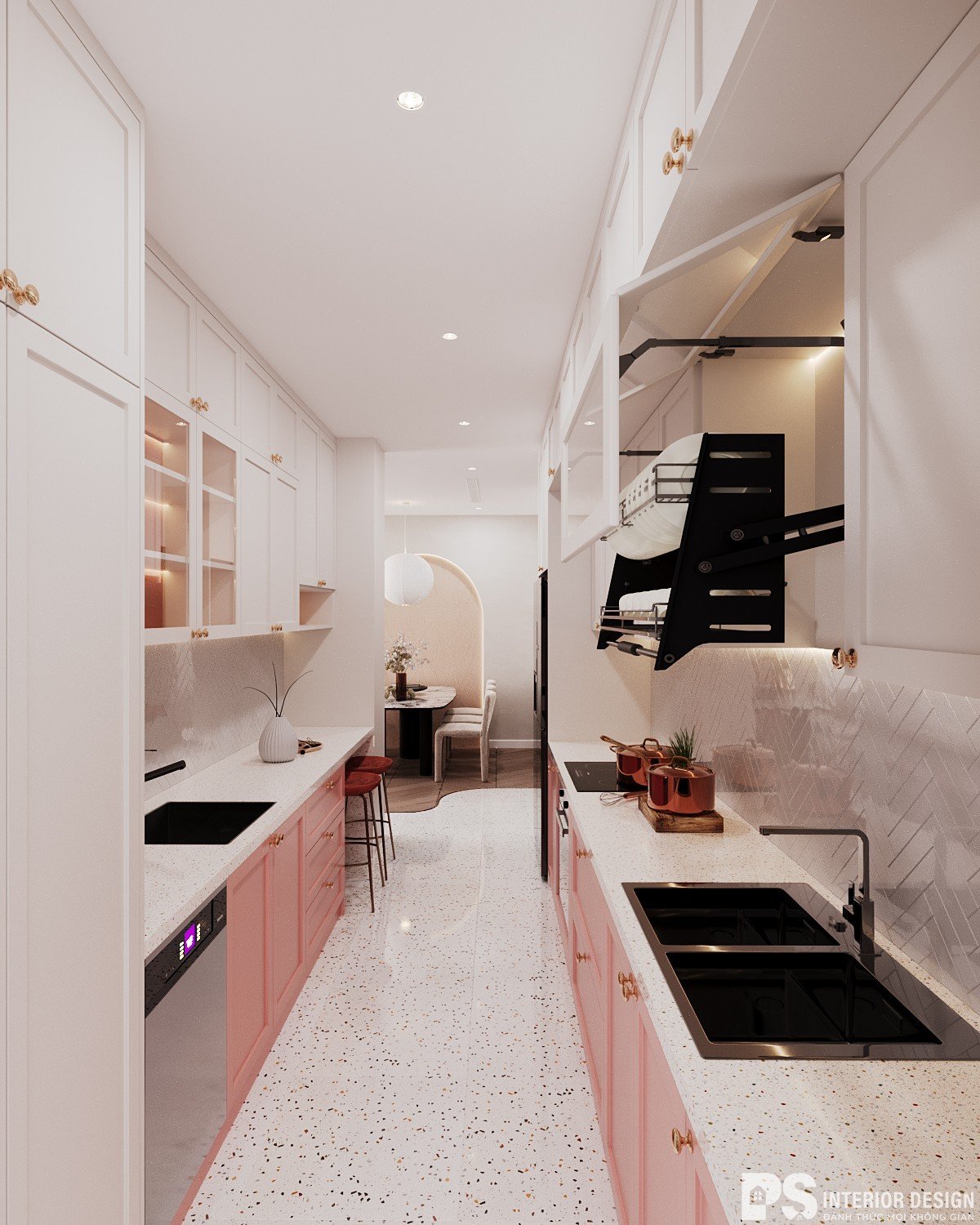 Những cô nàng có tâm hồn bay bổng chắc chắn không thể bỏ qua căn bếp này khi màu hồng được pha trộn cùng với màu trắng của các tủ kệ bếp sẽ giúp các “cô chủ” của gian bếp này có thêm nhiều ý tưởng nấu ăn.