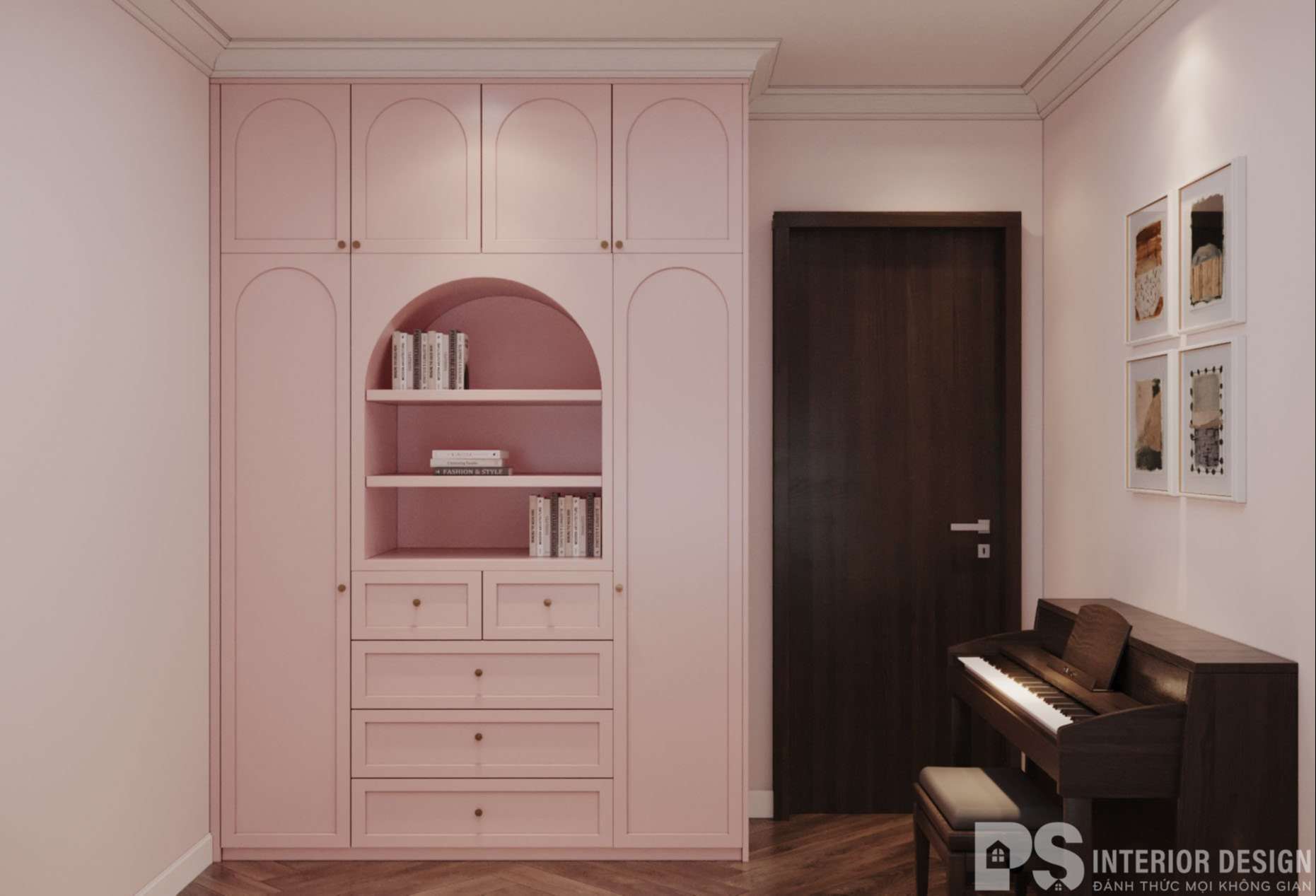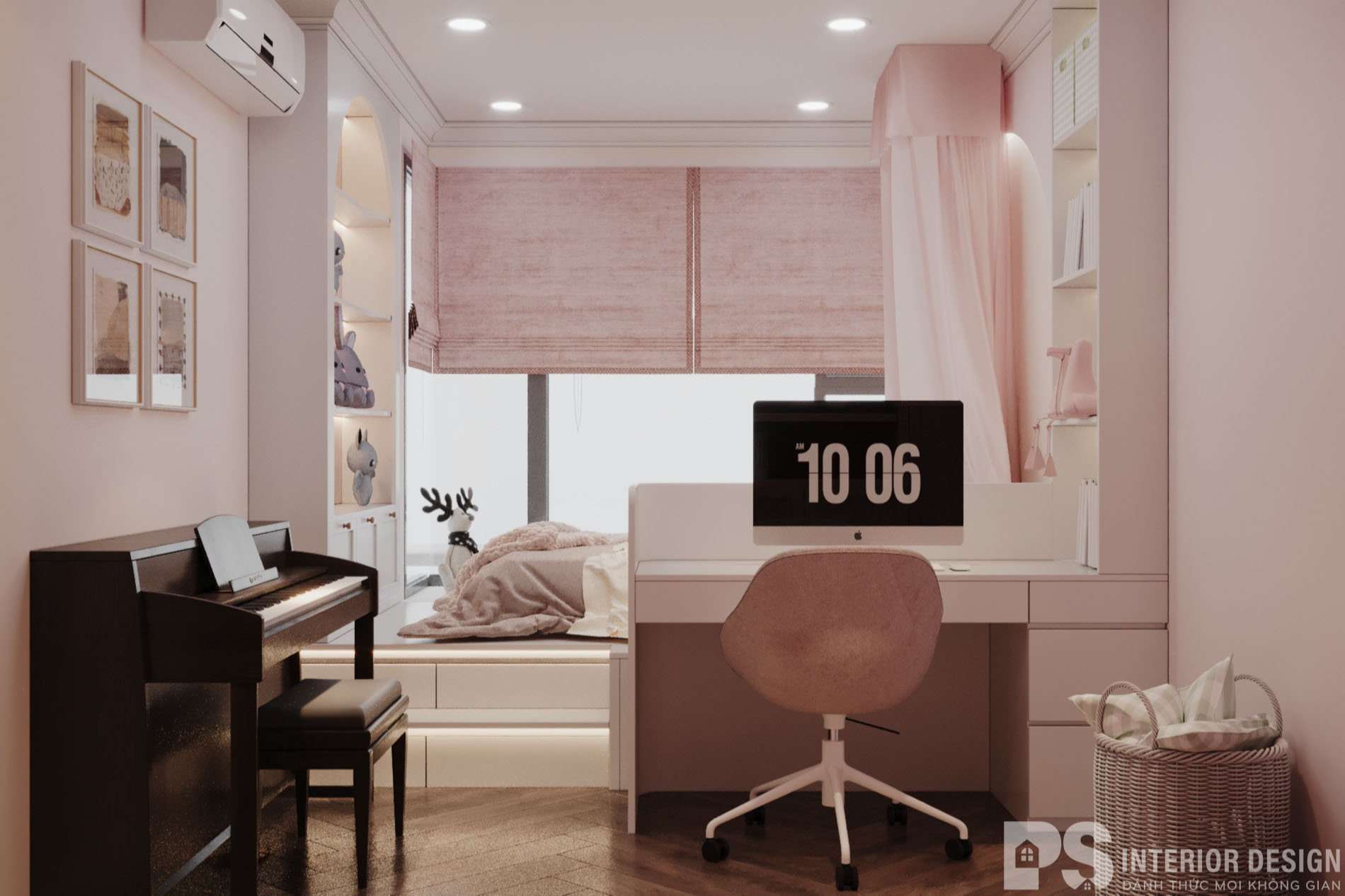 Thiết kế nội thất phòng ngủ dành cho bé tràn ngập nét tươi sáng của màu sắc hồng pastel. Phòng ngủ của con được bố trí và thiết kế nội thất đơn giản, chủ yếu chú trọng vào công năng sử dụng của các đồ nội thất sao cho con được nghỉ ngơi thư giãn tiện lợi và thoải mái nhất.