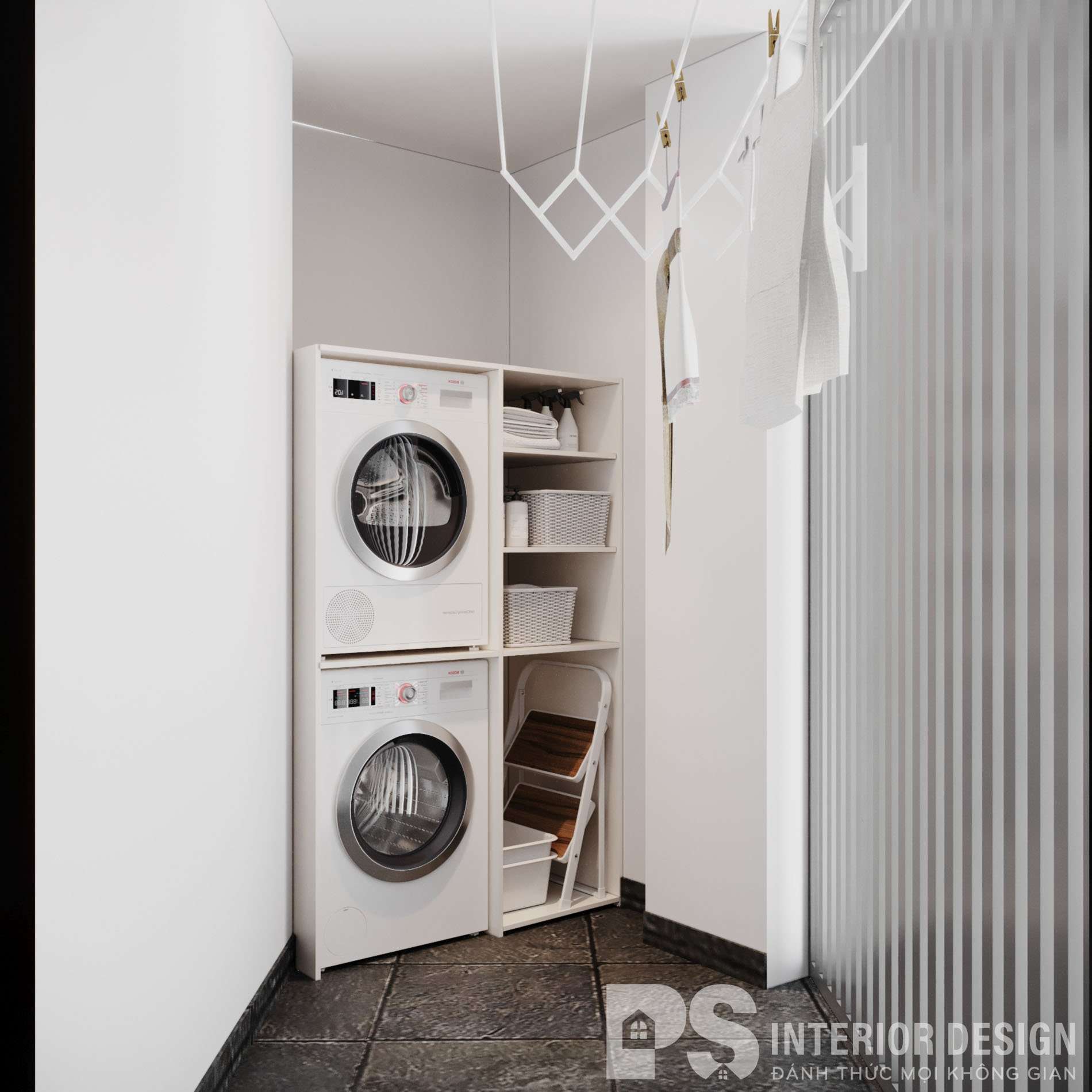 Khu vực giặt đồ được thiết kế tiện dụng với dây phơi đồ tiện dụng và tủ được thiết kế tích hợp và thông minh phục vụ sắp xếp đồ dùng khi giặc một cách ngăn nắp và dễ dàng tìm kiếm khi cần.