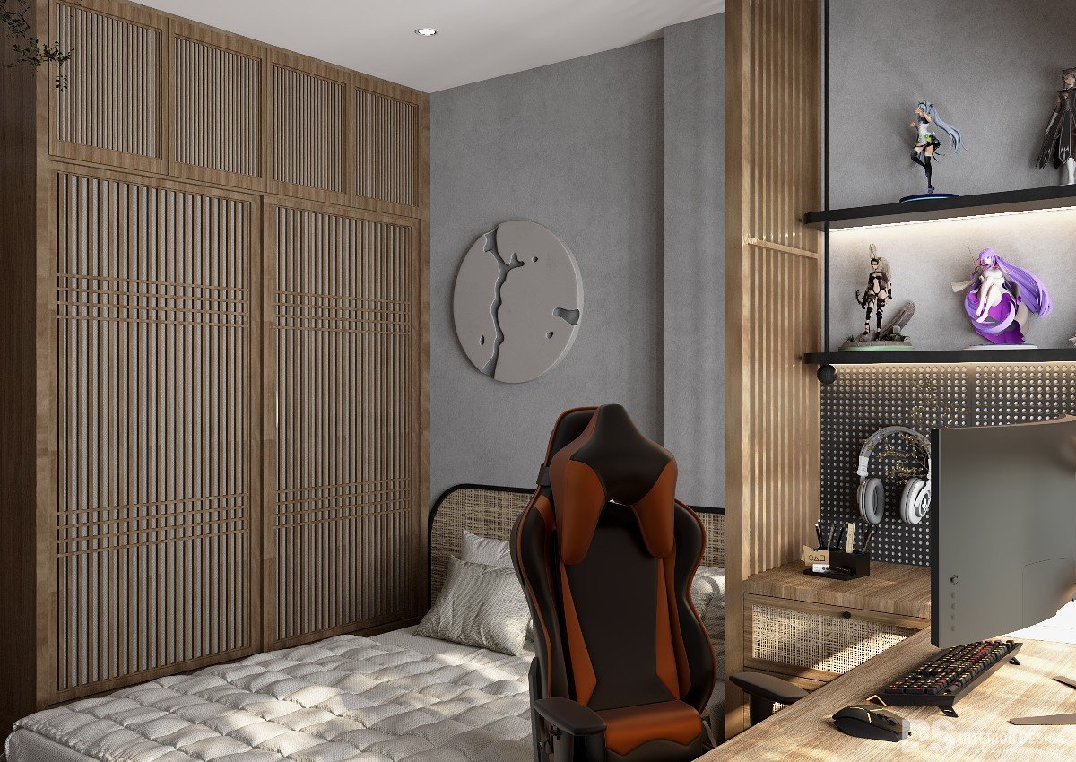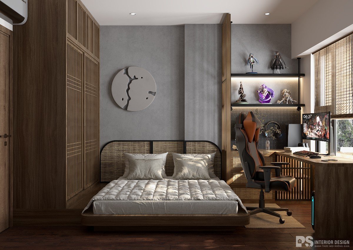 Phòng ngủ phụ với diện tích không quá lớn nên PS đã lựa chọn lối thiết kế tối giản cùng với nội thất thông minh và tiết kiệm diện tích đã kiến tạo ra một không gian vừa đủ, ngoài ra căn phòng còn có đầy đủ công năng mang đến một căn phòng ngủ tiện nghi và dễ chịu.