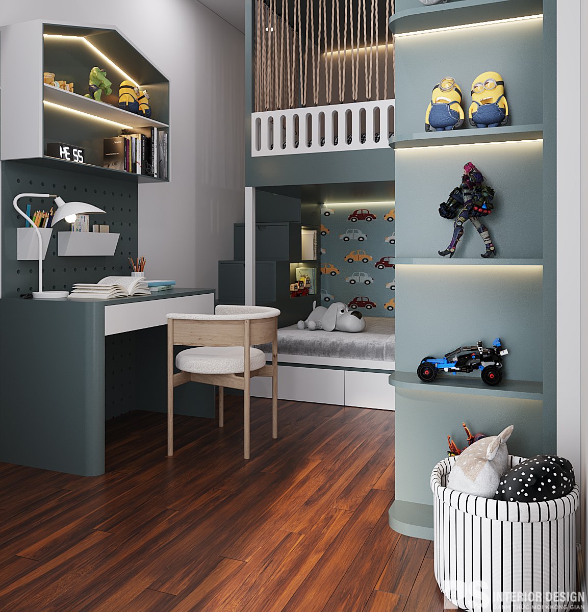 Không gian phòng ngủ cho bé được thiết kế dễ thương, sinh động và tối ưu diện tích giúp giữ được không gian rộng rãi để bé có thể thoải mái vui chơi, sinh hoạt trong chính căn phòng của mình.