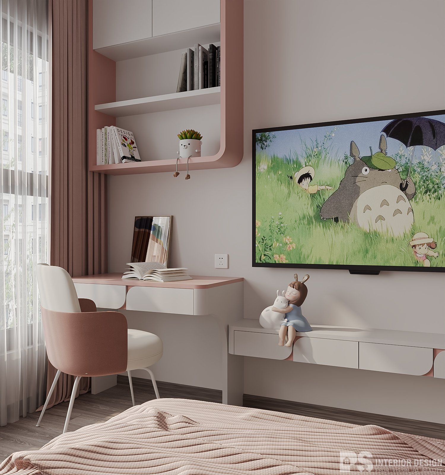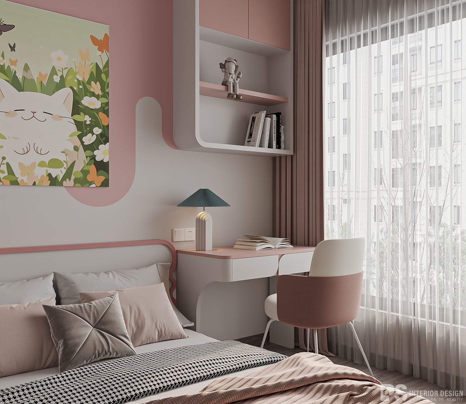 Phòng ngủ bé gái được thiết kế với tông màu hồng chủ đạo, mang lại cảm giác ấm áp và dễ thương. Nội thất được bố trí tổng thể đơn giản nhưng đầy duyên dáng với các đường cong mềm mại, tạo nên không gian thân thiện và an toàn cho trẻ nhỏ. Một bàn học tinh gọn và tiện lợi được bố trí hợp lý, giúp bé có không gian học tập thoải mái và tập trung. Trên tường đầu giường, một bức tranh hoạt hình đáng yêu với những nhân vật ngộ nghĩnh tạo điểm nhấn vui tươi và sinh động, hoàn thiện vẻ đẹp hồn nhiên, năng động của căn phòng.