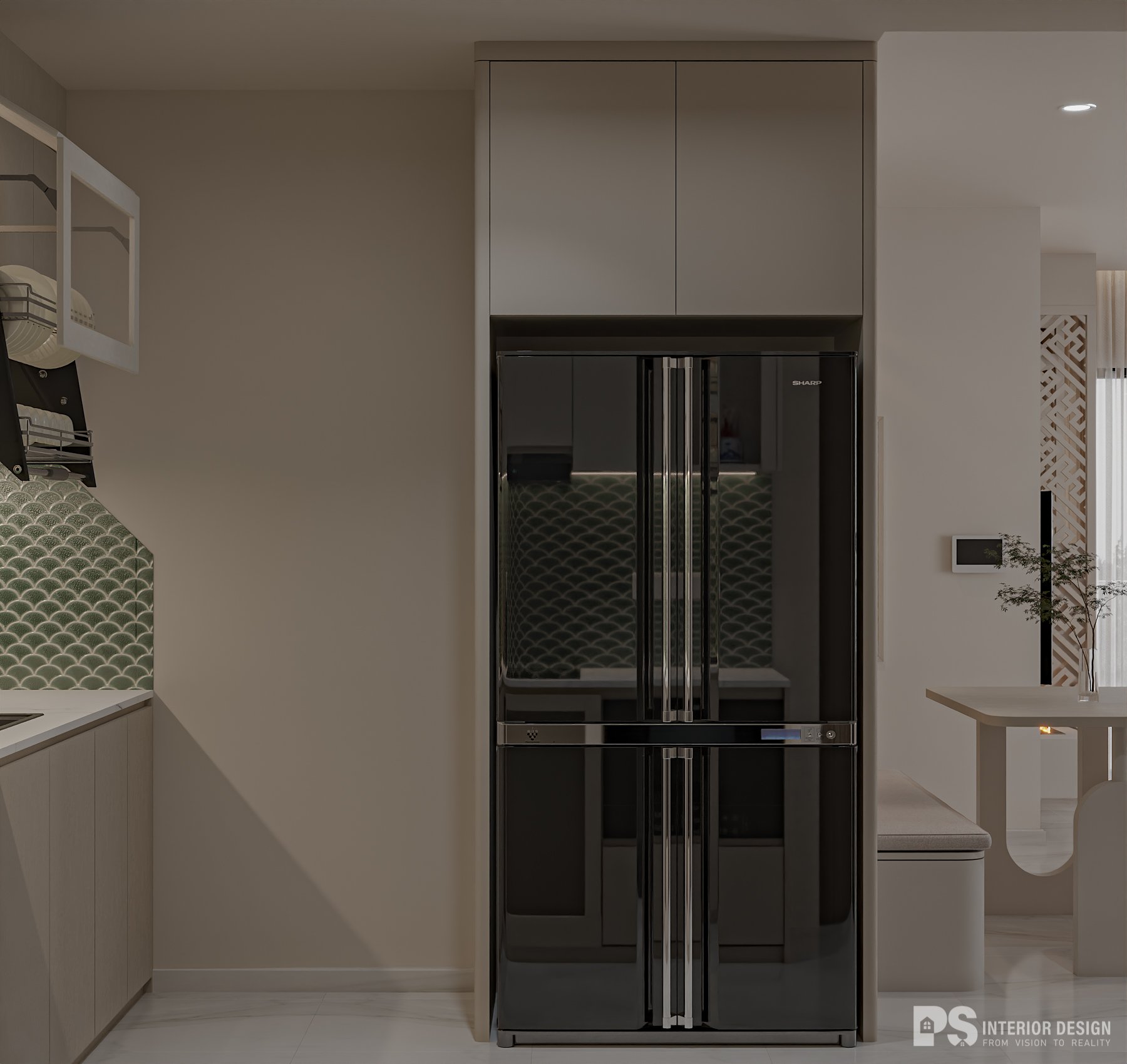 Khu vực bếp ở vị trí khuyết trong không gian, dường như được ẩn đi thể hiện sự ý nhị và tinh tế của gia chủ. Mặt khác, bàn ăn chính là trung tâm điểm nhìn thay bếp và trở thành điểm kết nối truyền hơi thở ấm cúng sum vầy cho cả ngôi nhà. Nhưng, căn bếp vẫn được sắp đặt rất tiện nghi và chỉn chu để gia chủ tự do "vẫy vùng" với niềm đam mê nấu nướng.
