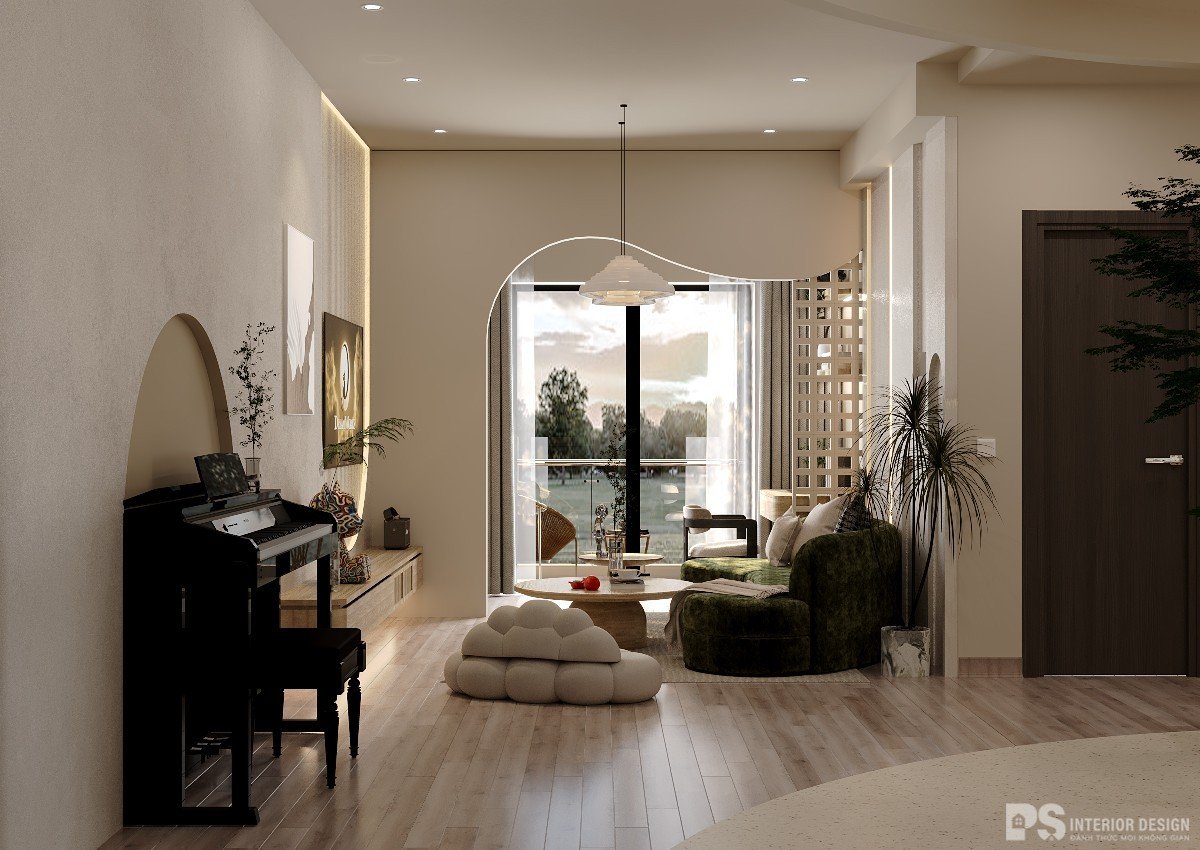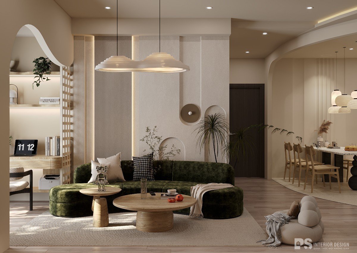 Phòng khách được thiết kế với tông màu trung tính và sử dụng các vật liệu tự nhiên như gỗ và vải lanh. Chiếc sofa bọc vải màu xanh rêu kết hợp cùng bàn trà bằng gỗ tự nhiên tạo điểm nhấn cho không gian. Các chi tiết như đèn trần với thiết kế đơn giản và cây xanh mang đến sự gần gũi với thiên nhiên.