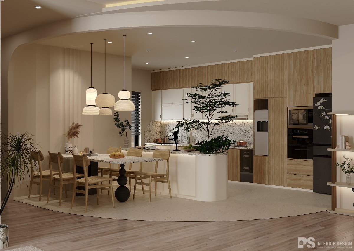 Khu vực phòng ăn được bố trí liền kề với phòng khách, tạo cảm giác liên thông và mở rộng không gian. Bộ bàn ghế ăn bằng gỗ với thiết kế tối giản nhưng tinh tế. Đèn trần hình tròn làm từ mây tre đan tạo điểm nhấn mềm mại và ấm cúng cho không gian ăn uống.