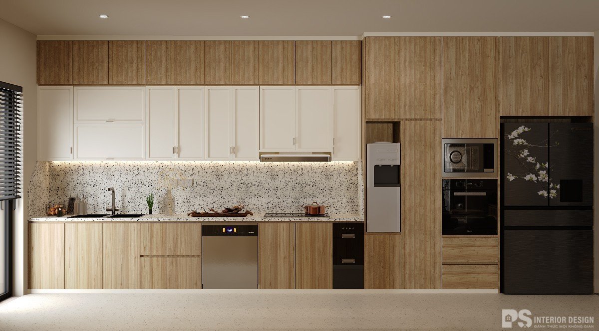 Thiết kế tối giản, tập trung vào sự tiện nghi và gọn gàng, loại bỏ những chi tiết không cần thiết, mang lại cảm giác thoáng đãng và sạch sẽ. Cây xanh và các yếu tố tự nhiên được thêm vào để tăng sự sinh động và kết nối với thiên nhiên, tạo nên một phòng bếp không chỉ đẹp mắt mà còn mang lại cảm giác thư giãn và thoải mái cho gia chủ.
