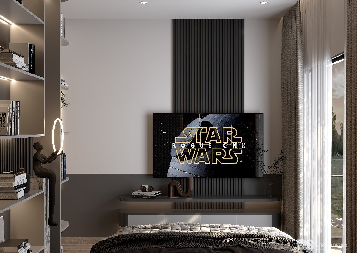 Phòng ngủ thiết kế theo phong cách Wabi Sabi mang lại không gian yên tĩnh và thư thái, hoàn hảo cho việc nghỉ ngơi. Sử dụng các tông màu trung tính như xám, nâu và be, căn phòng toát lên vẻ ấm cúng và tĩnh lặng. Các vật liệu tự nhiên như gỗ, vải lanh và đá được lựa chọn kỹ lưỡng, từ giường ngủ, bàn trang trí đến các kệ sách, tất cả đều thể hiện sự mộc mạc và gần gũi.