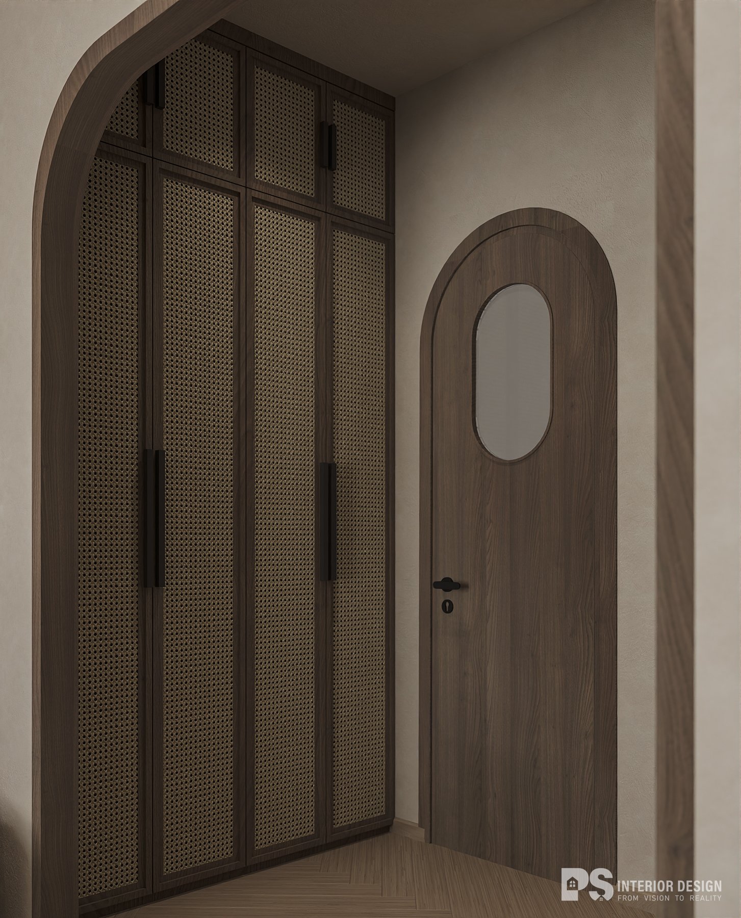 Sự tiết chế trong cách bố trí hệ kệ tủ đơn giản, với dụng ý để thấy rằng con người ta chẳng cần quá nhiều để trải nghiệm, mà chỉ cần vừa đủ để trọn vẹn đong đầy. Ngoài ra, việc thiết kế các lối ra vào với dáng vòm cong rất duyên tạo nên điểm nhấn đặc trưng cho căn hộ.