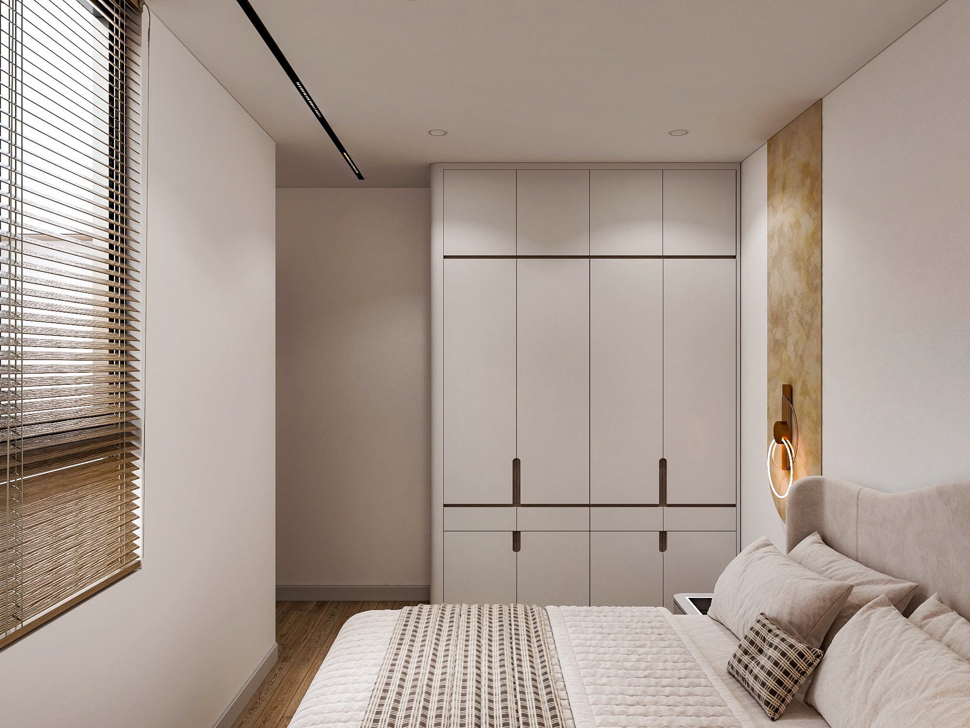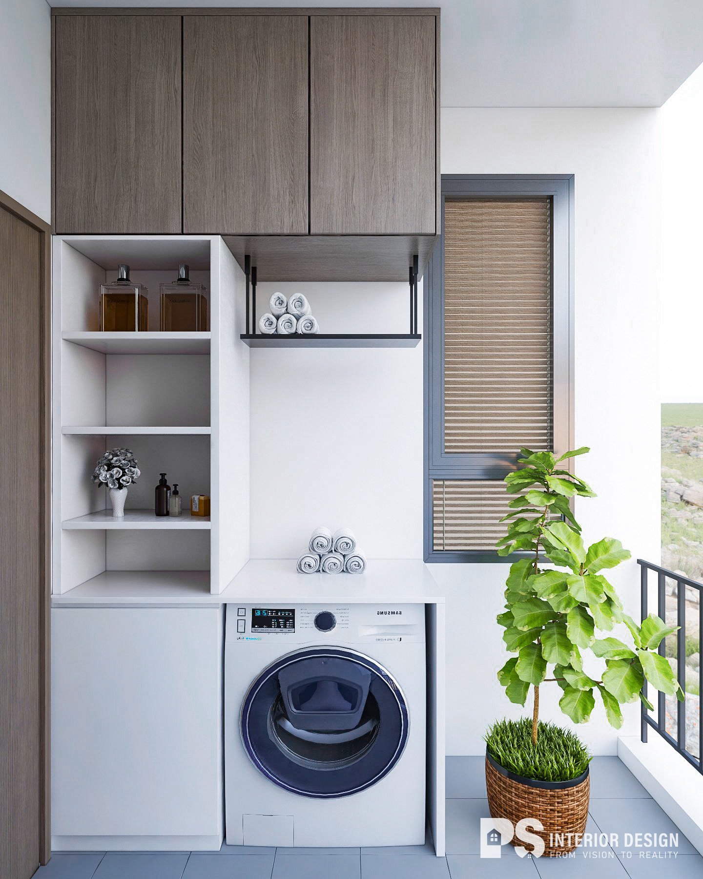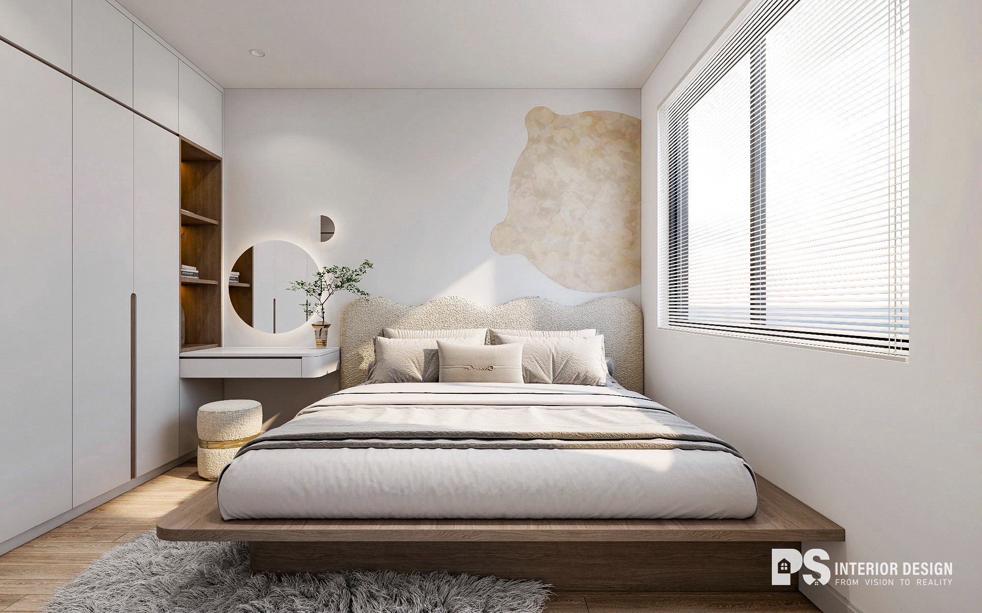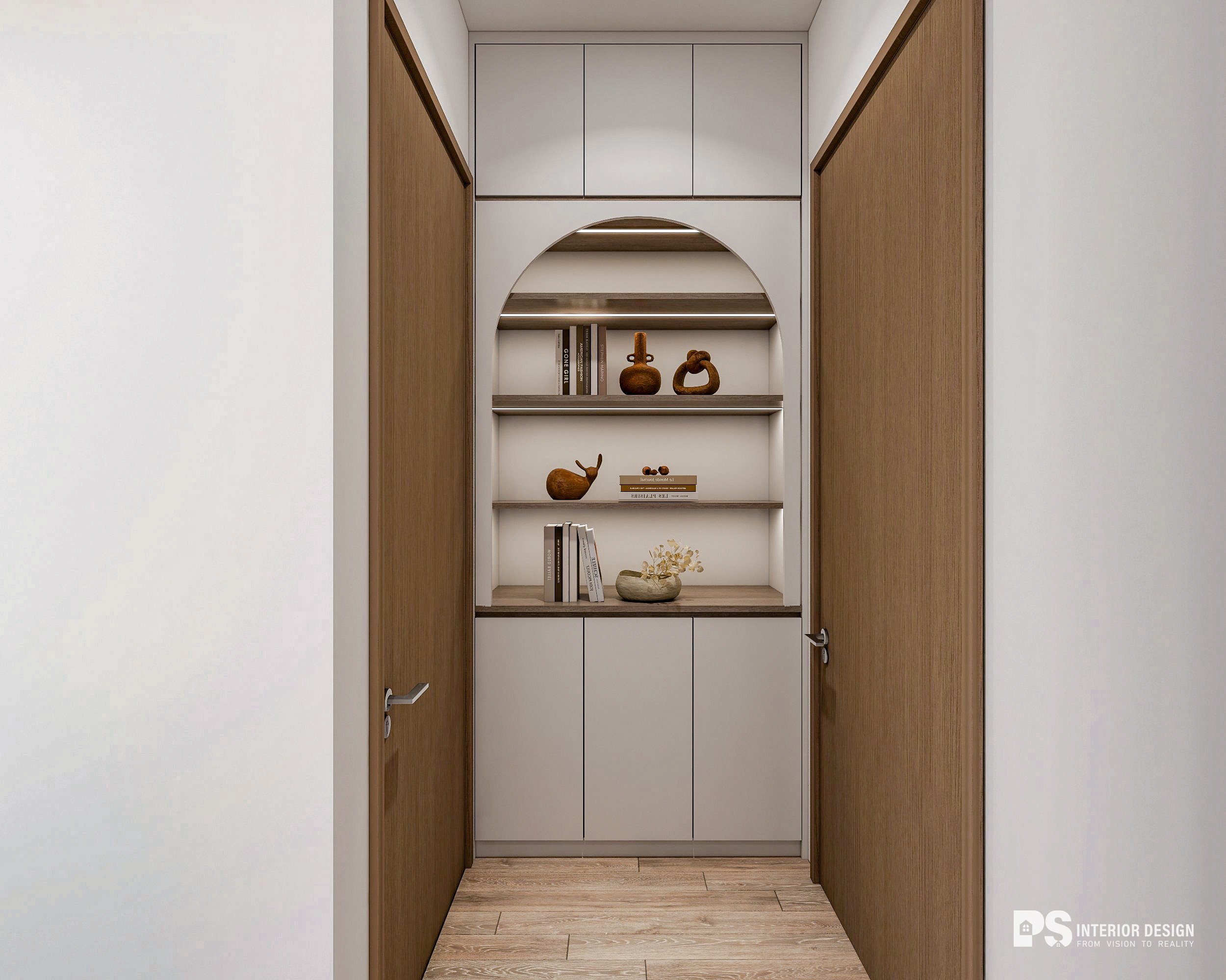 Điểm nhấn cho căn hộ là vẻ đẹp Wabi Sabi với các chi tiết nội thất trẻ trung, độc đáo. Công năng và tiện ích cũng được PS chú trọng bằng việc bố trí kệ tủ đầy đủ tại nhiều khu vực khác nhau.