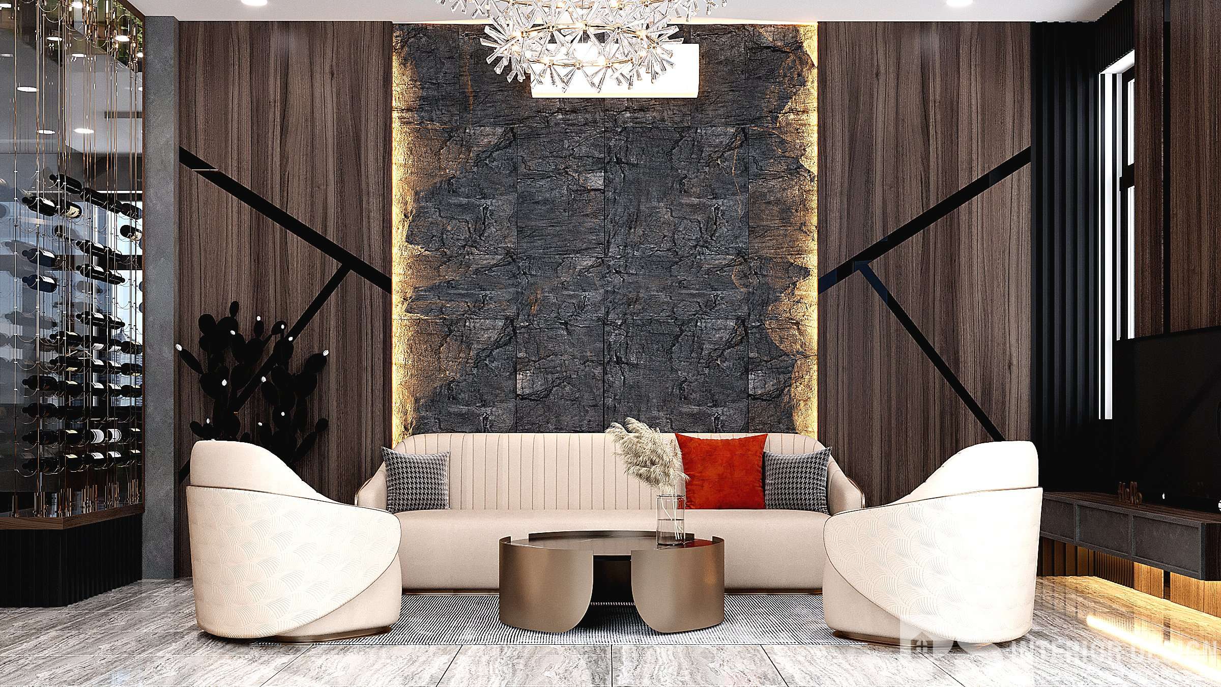 Căn nhà pha trộn nét đẹp truyền thống với dòng chảy hiện đại mang đến không gian sang trọng đẳng cấp. Bộ sofa sẽ là điểm nhấn giữa tone màu trung tính tổng thể của phòng khách. Phòng khách được thiết kế đơn giản với điểm nhấn là bức tường sơn hiệu ứng độc đáo.