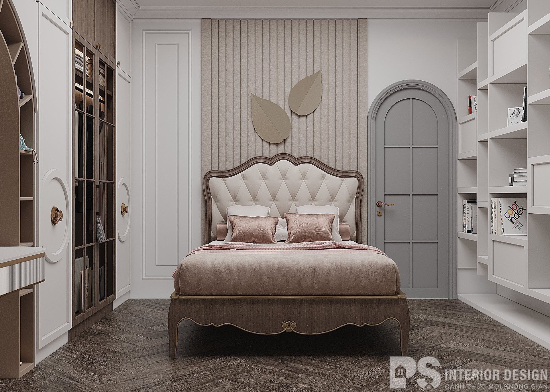 Khác với phòng ngủ Master, phòng ngủ phụ được chọn tone màu pastel, phù hợp với người có tính cách nhẹ nhàng, mềm mại. Vách ốp được thiết kế với 2 chiếc lá với những đường bo cong mềm mại.