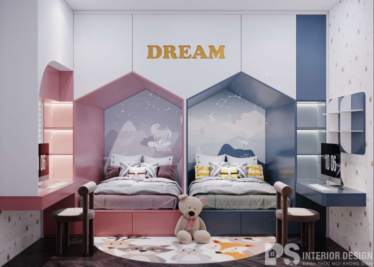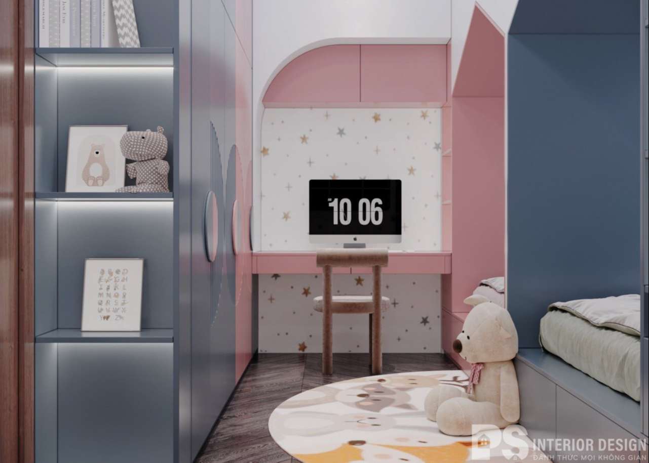 Phòng ngủ cho bé có tone màu tươi mát, đáng yêu được thiết kế thông minh với lối bố trí song song cả hai giường, bàn học và tủ quần áo nhưng vẫn đảm bảo giữ được diện tích, không gian sinh hoạt vui chơi cho bé.