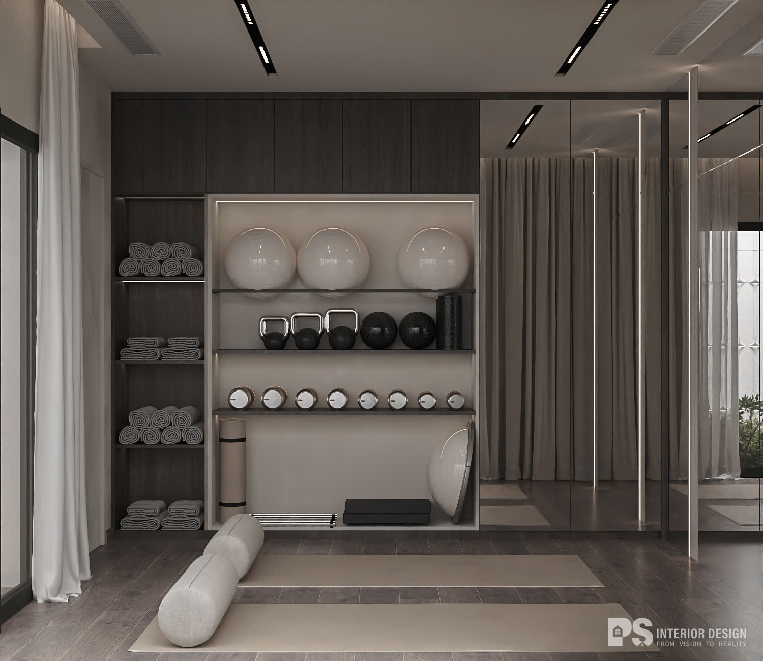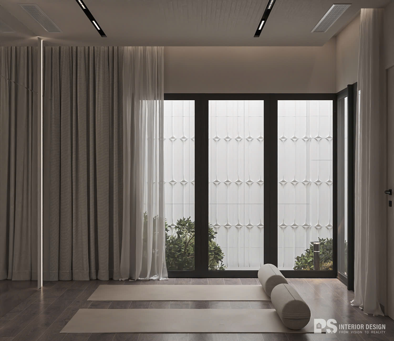 Phòng thể thao được bố trí tinh gọn, thoáng rộng; cho sự điều hòa hơi thở, tập trung lắng nghe cơ thể.