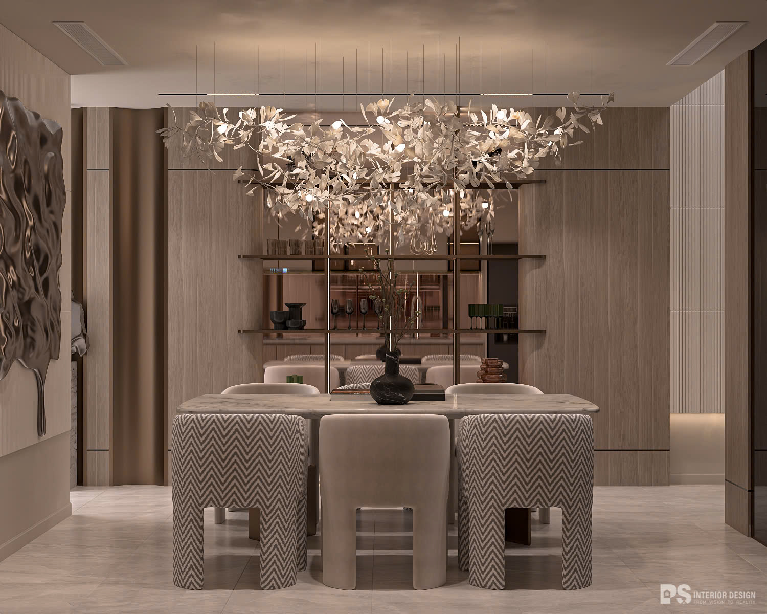 Vật liệu bóng như: kim loại mạ đồng, kính và những đường thẳng khúc chiết là nền tảng sắc sảo của tổng thể. Đồng thời, PS giảm thiểu sự phức tạp bằng cách chỉ sử dụng hai vật liệu và bảng màu thống nhất.