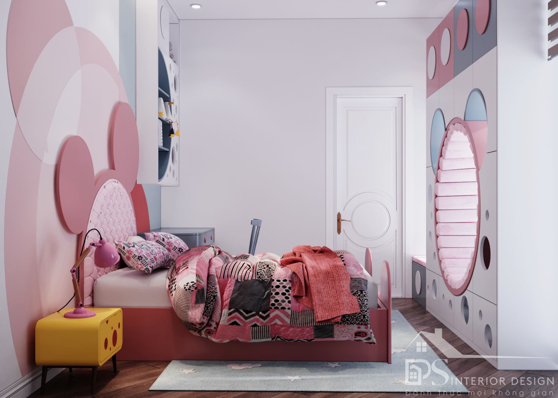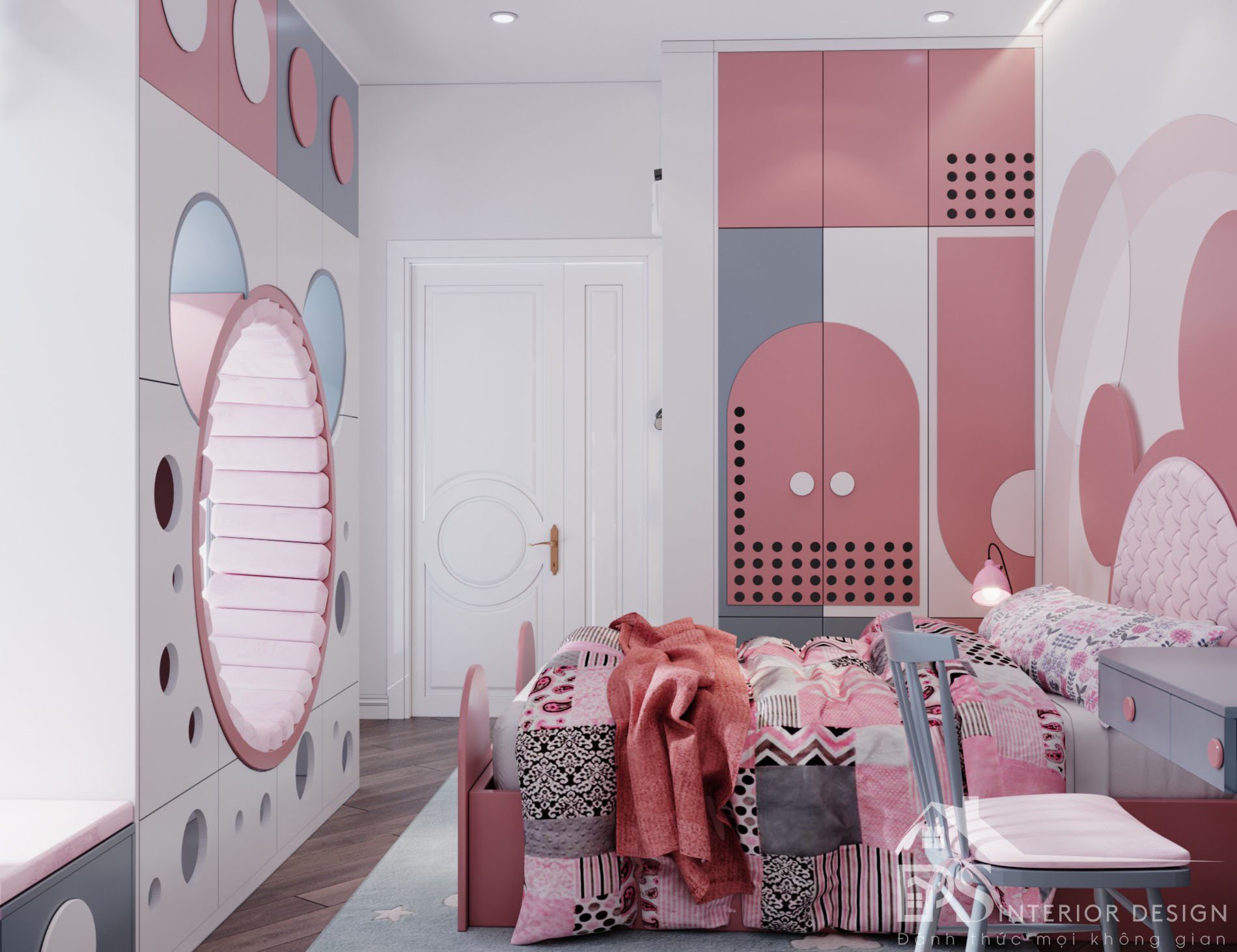 Gam màu hồng tươi sáng, ngọt ngào và đáng yêu dành cho bé gái. Căn phòng được thiết kế tối ưu diện tích và bày trí nội thất thông minh tạo được không gian sinh hoạt rộng rãi và thông thoáng cho bé giúp bé có thể tự do thoải mái hoạt động trong căn phòng của mình.