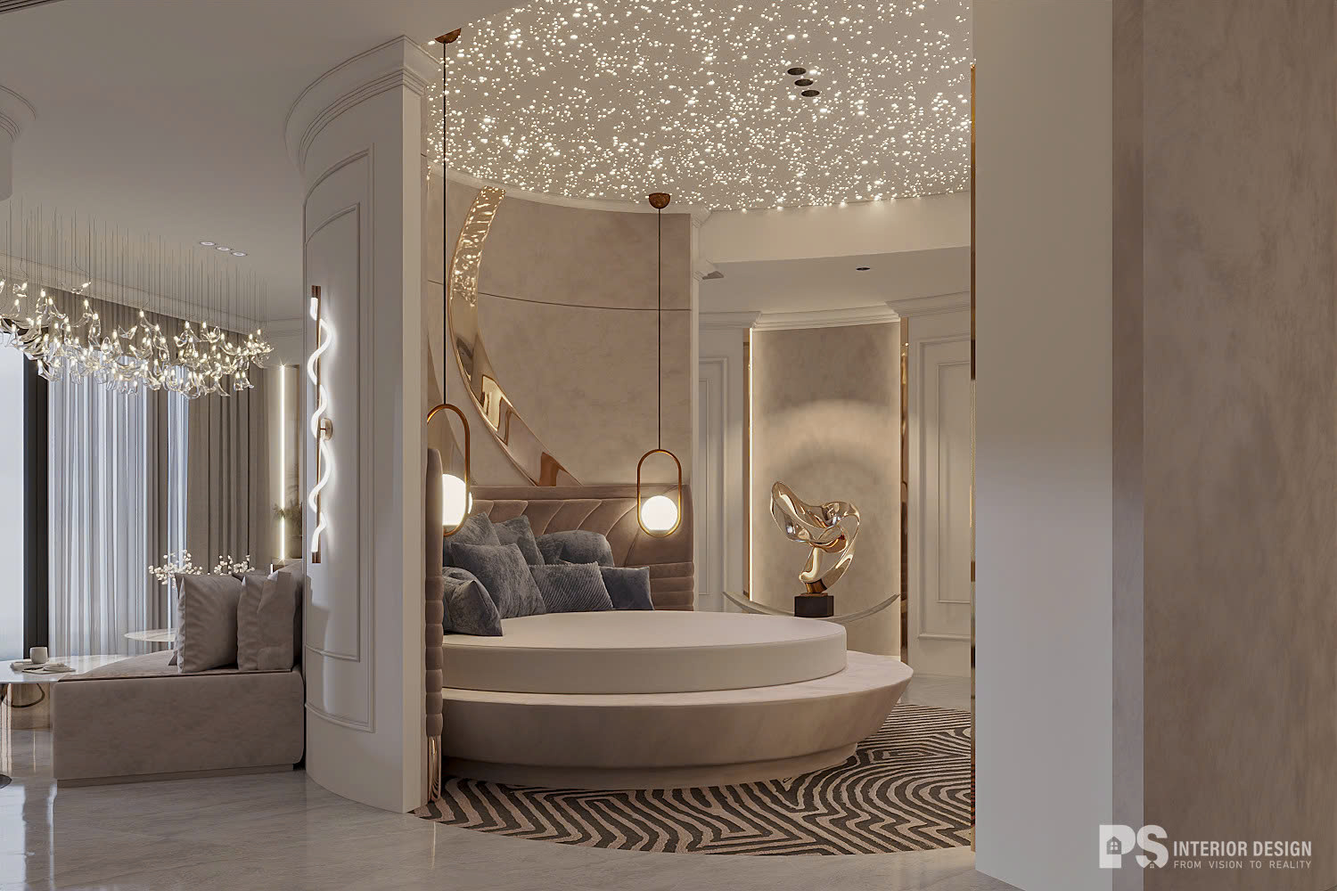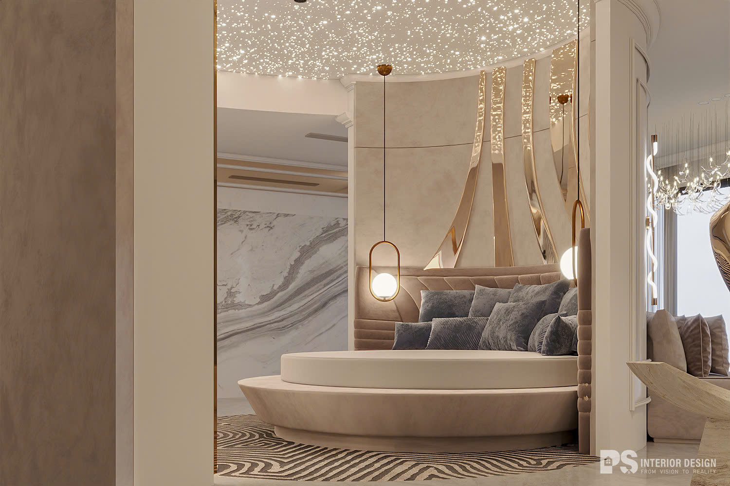 Nội thất tinh xảo là: đèn trần lung linh, với các chi tiết mạ kim loại óng ánh. Cách bố trí không gian là chìa khóa cho nét đặc trưng của căn nhà. Mỗi không gian đều được chia tách rõ ràng, nhưng vẫn đảm bảo sự kết nối và liền mạch. Giường ngủ có bọc nệm đầu giường mềm mại cùng các chi tiết như phào chỉ trên tường sẽ mang lại cảm giác hoàng gia, thoải mái và ấm áp.