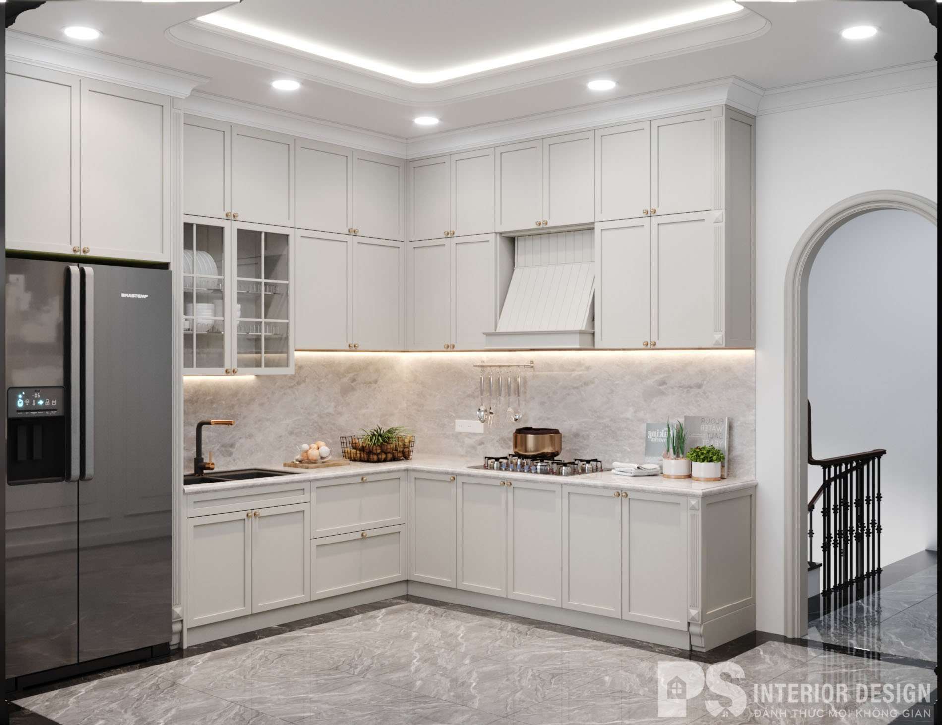 Khu bếp chữ L với tone màu trắng tinh khôi pha trộn một chút xám của đá nhân tạo mang đến cảm giác sang trọng đẳng cấp, ngoài ra căn bếp cũng được thiết kế tối ưu công năng giúp việc nấu ăn sinh hoạt chung trở nên tuyệt vời hơn bao giờ hết.