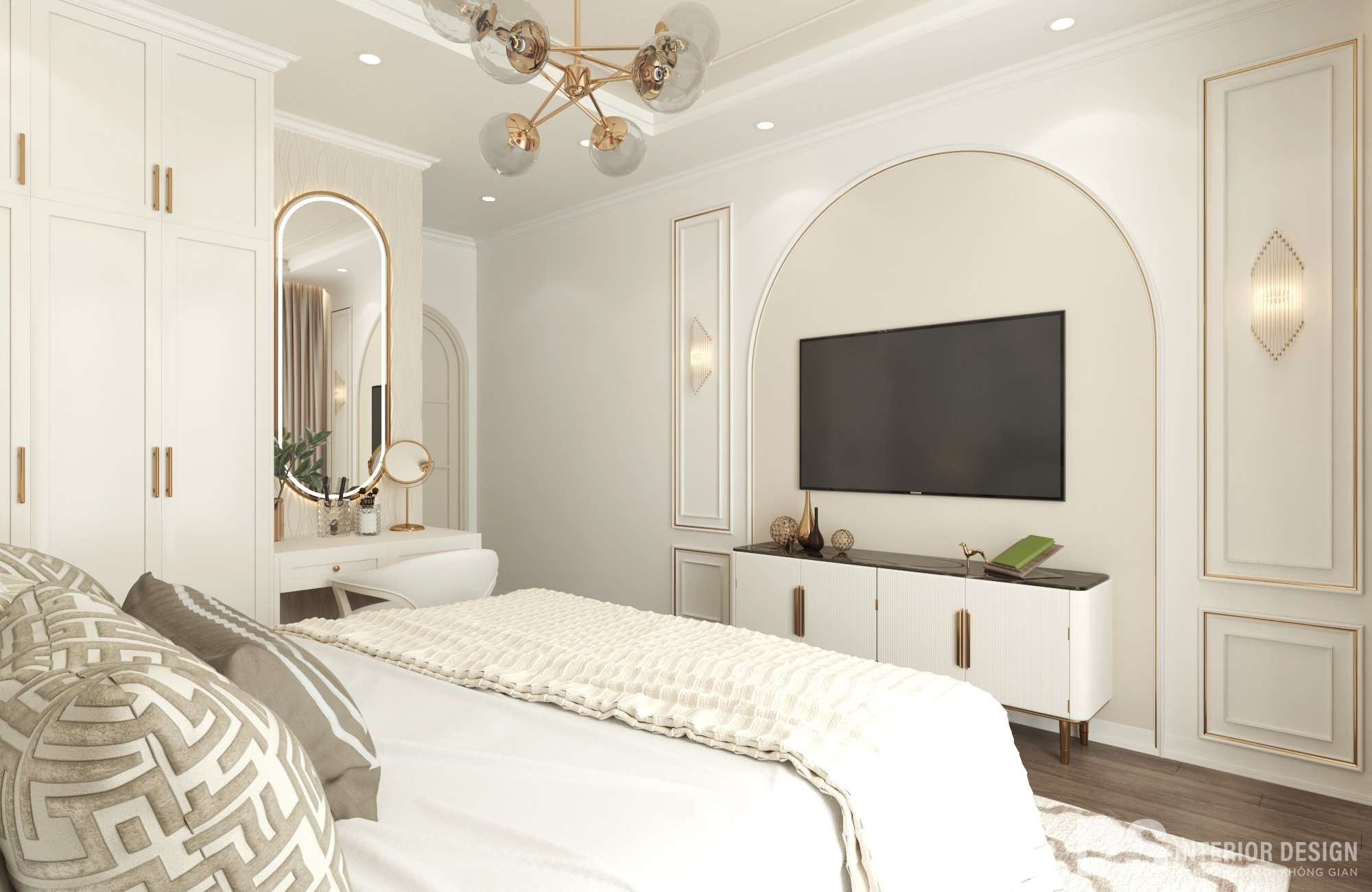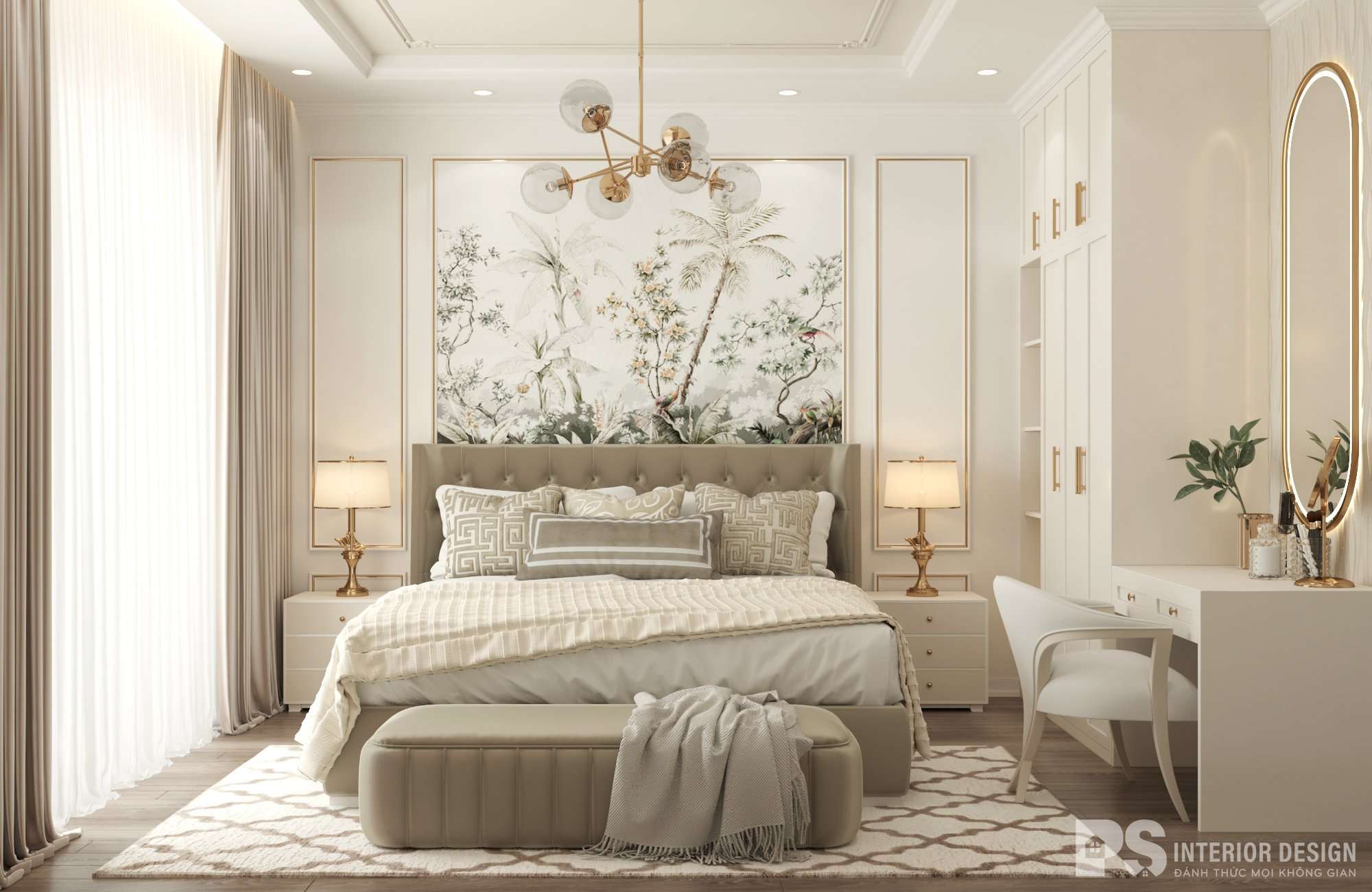 Phòng ngủ master có gam màu trung tính nhẹ nhàng trang nhã, cùng với đó căn phòng được trang trí các phụ kiện độc đáo như đèn chùm, tranh vẽ nghệ thuật thiên nhiên tạo sự gần gũi và kết nối với bên ngoài mang đến một màu sắc tươi mới trẻ trung cho căn phòng ngủ.
