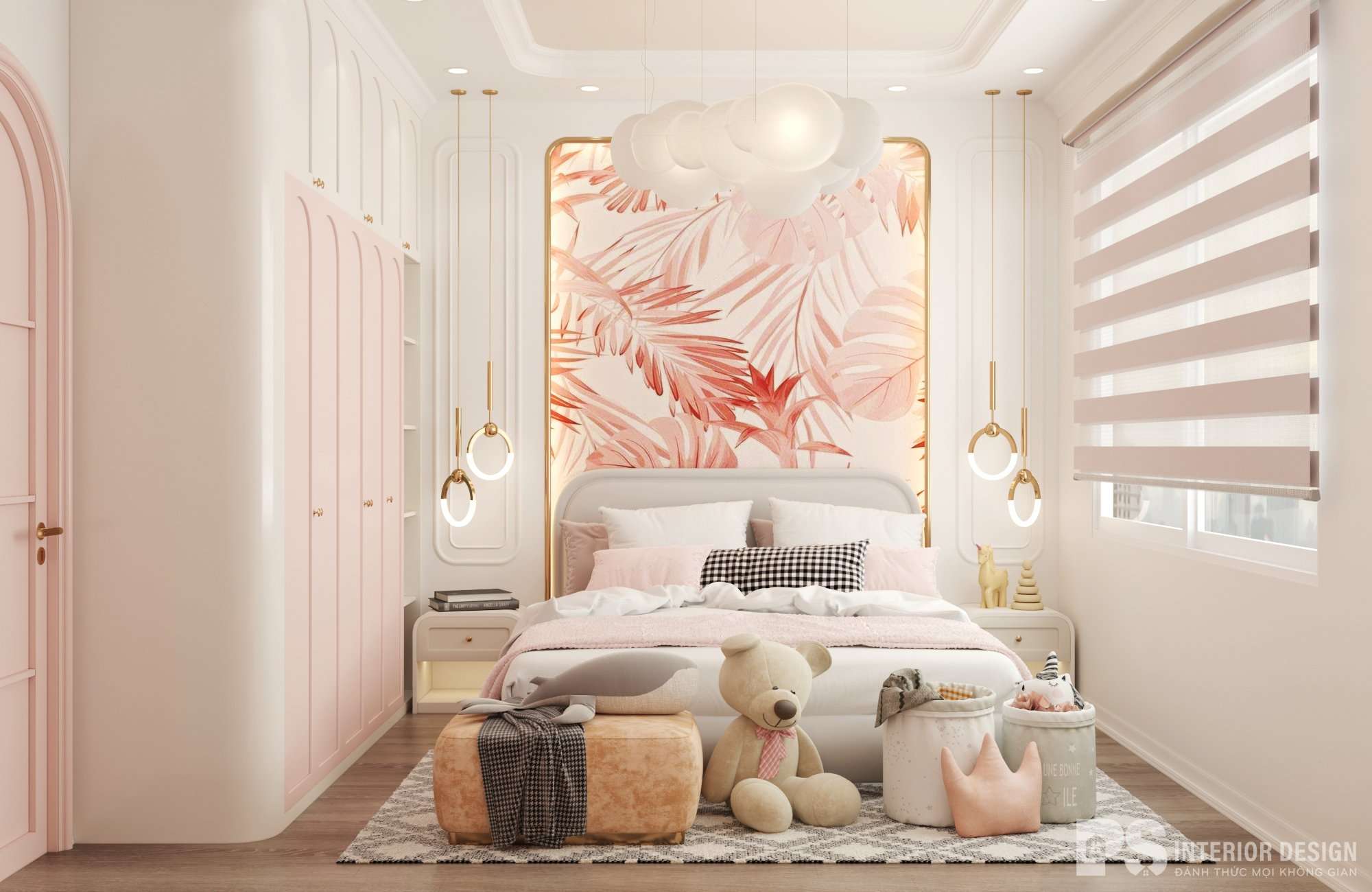 Với tone màu trắng hồng chủ đạo vô cùng ngọt ngào tinh khiết căn phòng còn được bố trí thông mình với tủ quần áo kịch trần, bàn học, kệ tivi,... và các phụ kiện vô cùng đáng yêu, xinh xắn giúp căn phòng vừa có diện tích sinh hoạt thoải mái vừa đẹp mắt thu hút mọi ánh nhìn.