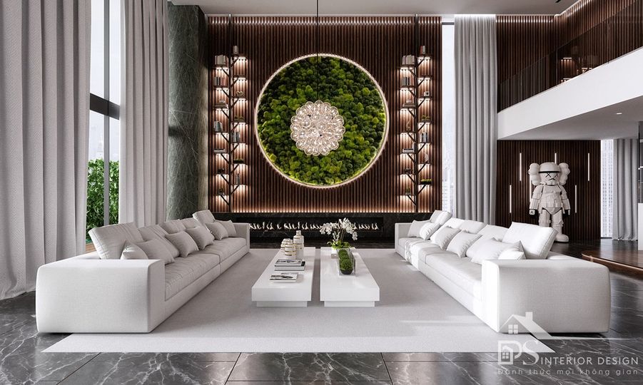 Trên bề mặt vách ốp thiết kế giả cây cối bên trong mang đến hương vị thiên nhiên cho tổng thể phòng khách. Khiến cho căn phòng trở nên gần gũi và thêm nét mộc mạc hơn