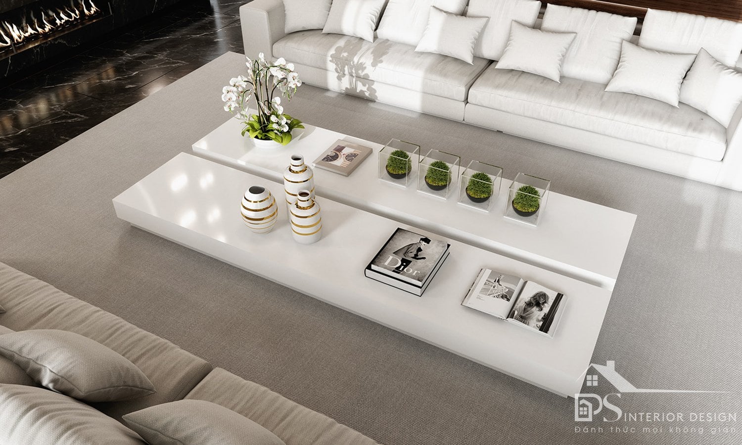Bàn trà chân thấp màu trắng với đường kẻ sọc phân chia thành 2 làn tạo ra sự mới mẻ độc đáo, kết hợp với các chậu cây nhỏ là điểm sáng vô cùng quan trọng cho nơi này