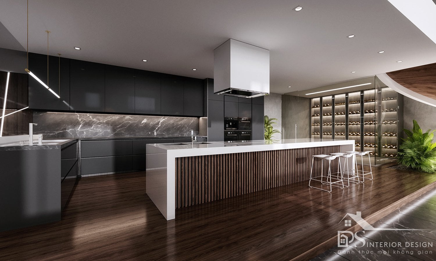Khu vực tủ bếp được thiết kế màu đen sơn phủ 2k tạo nên sự bóng loáng kết hợp với màu đen sang trọng. Với thiết kế gỗ An Cường chống mối mọt và chống thấm nước cao nên tạo độ bền cho khu vực bếp