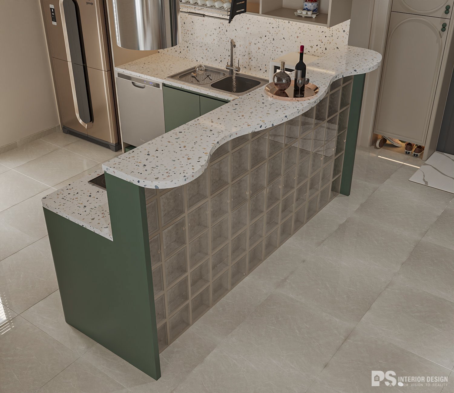 Bếp nhà với chất liệu gạch kính mang lại vẻ đẹp sạch sẽ, sáng sủa và thêm phần sang trọng cho không gian. Việc bố trí tủ đóng cho phòng bếp là sự sắp xếp gọn gàng, thông minh cho căn hộ hiện đại. Dáng hình bàn bếp uốn cong lạ mắt, nhẹ nhàng tựa như "lời yêu thương" dịu dàng, ấm cúng gia đình.