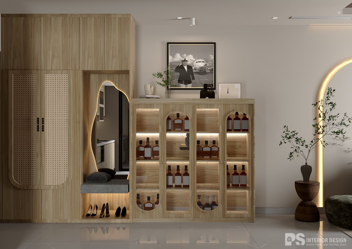 Phong cách Wabi Sabi chú trọng sử dụng các chất liệu tự nhiên để tạo nên sự gần gũi và ấm áp. Trong căn hộ này, chất liệu gỗ được sử dụng nổi bật ở tủ kệ, bàn và các vật dụng trang trí. Tủ đựng đồ với cánh cửa bằng gỗ sáng, nội thất được chiếu sáng tạo nên sự tương phản ấm áp và tinh tế.