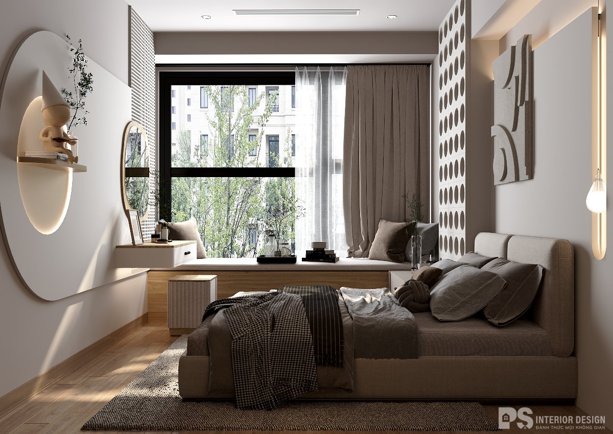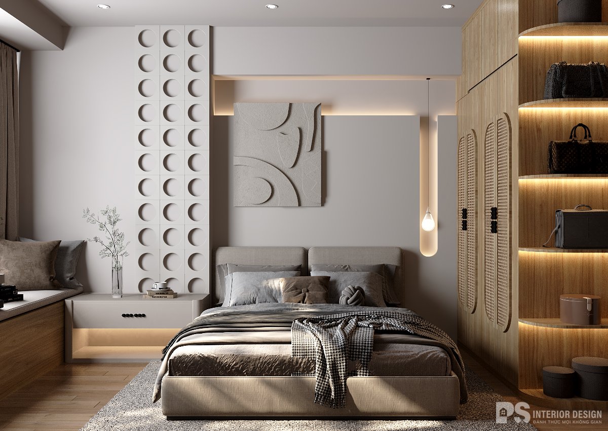 Phòng ngủ trong căn hộ Midtown thiết kế theo phong cách Wabi Sabi mang lại cảm giác yên bình và gần gũi với thiên nhiên. Tông màu trung tính như: xám, trắng và nâu nhạt được sử dụng chủ đạo, tạo nên không gian thanh tịnh và thoải mái. Giường ngủ với chất liệu vải mềm mại, kết hợp cùng các chi tiết nội thất bằng gỗ, tạo nên sự ấm áp và gần gũi. Bức tường được trang trí bằng các họa tiết hình học đơn giản, mang lại điểm nhấn tinh tế cho căn phòng mà không làm mất đi sự mộc mạc vốn có của phong cách Wabi Sabi.