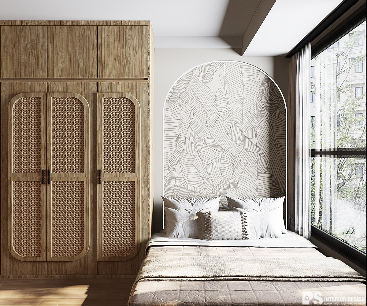 Ánh sáng tự nhiên được tận dụng tối đa qua các cửa sổ lớn, giúp căn phòng luôn sáng sủa và thoáng đãng. Các đèn treo được bố trí hợp lý, tạo ánh sáng nhẹ nhàng, ấm cúng vào buổi tối. Chậu cây nhỏ đặt bên cửa sổ mang lại hơi thở thiên nhiên, tăng thêm sự sinh động và tươi mới cho không gian. Tủ quần áo bằng gỗ với dáng hình đầy sáng tạo, không chỉ tiện dụng mà còn góp phần tạo nên vẻ đẹp tự nhiên và thẩm mỹ cho căn phòng. Tất cả các yếu tố này kết hợp hài hòa, tạo nên một phòng ngủ Wabi Sabi đúng nghĩa: đơn giản, tinh tế và tràn đầy cảm hứng từ thiên nhiên.