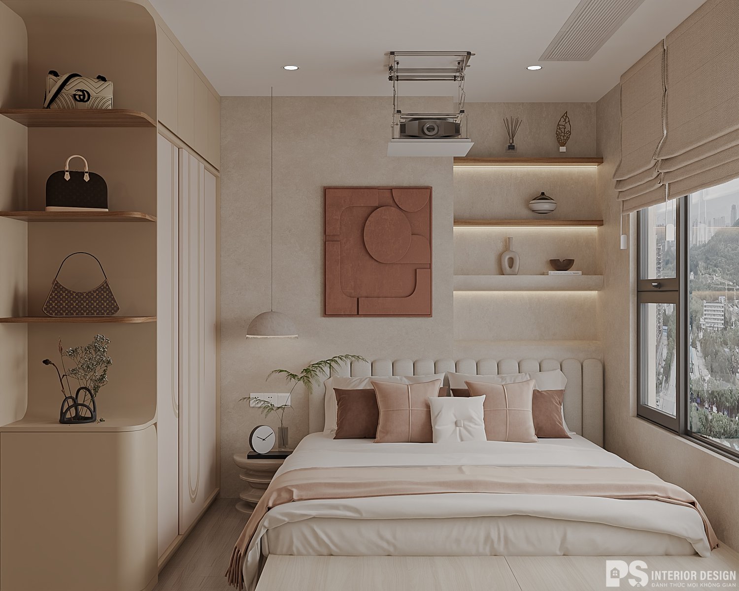 Một trong những cách đơn giản nhất để làm cho phòng ngủ nhỏ trôn g rộng rãi hơn là sử dụng gam màu sáng và trung tính. Màu trắng, be, hồng nhạt, xanh nhạt không chỉ tạo cảm giác rộng mở mà còn giúp làm mờ ranh giới giữa các bức tường và đồ đạc, tạo nên một không gian liền mạch và thoáng đãng. Ngoài ra, việc áp dụng màu sắc trung tính cho rèm cửa và các vật dụng trang trí sẽ giúp duy trì sự nhất quán trong thiết kế. Để không gian không trở nên nhàm chán, bạn nên thêm một vài điểm nhấn màu sắc nổi bật, nhưng nên giới hạn dưới 10% diện tích căn phòng để tránh cảm giác rối mắt.