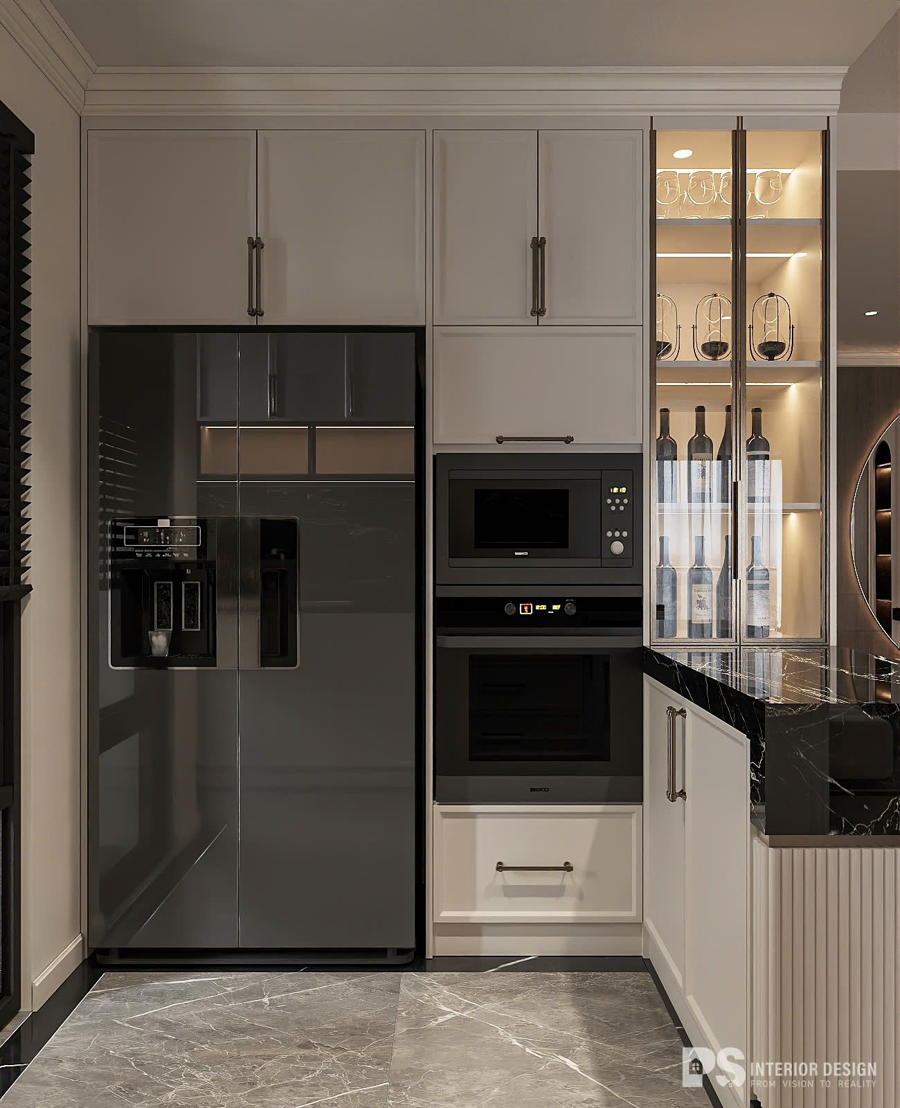 Trọng tâm không gian là sắc trắng, cùng chất liệu chủ đạo đá, kính, kim loại bóng bẩy mang lại khí chất cổ điển đắt giá mà vẫn giữ được tinh thần quyến rũ đương đại.